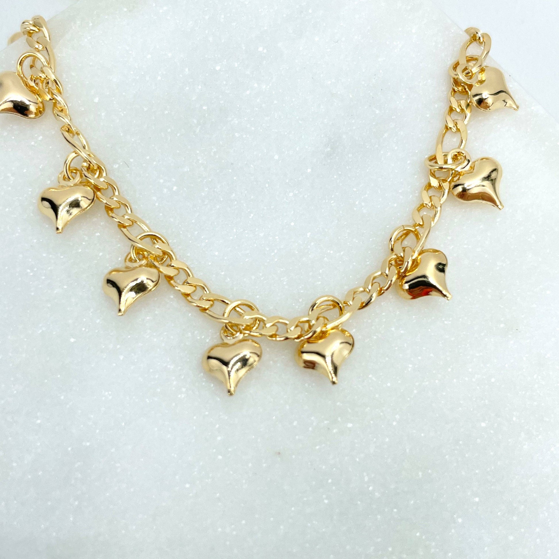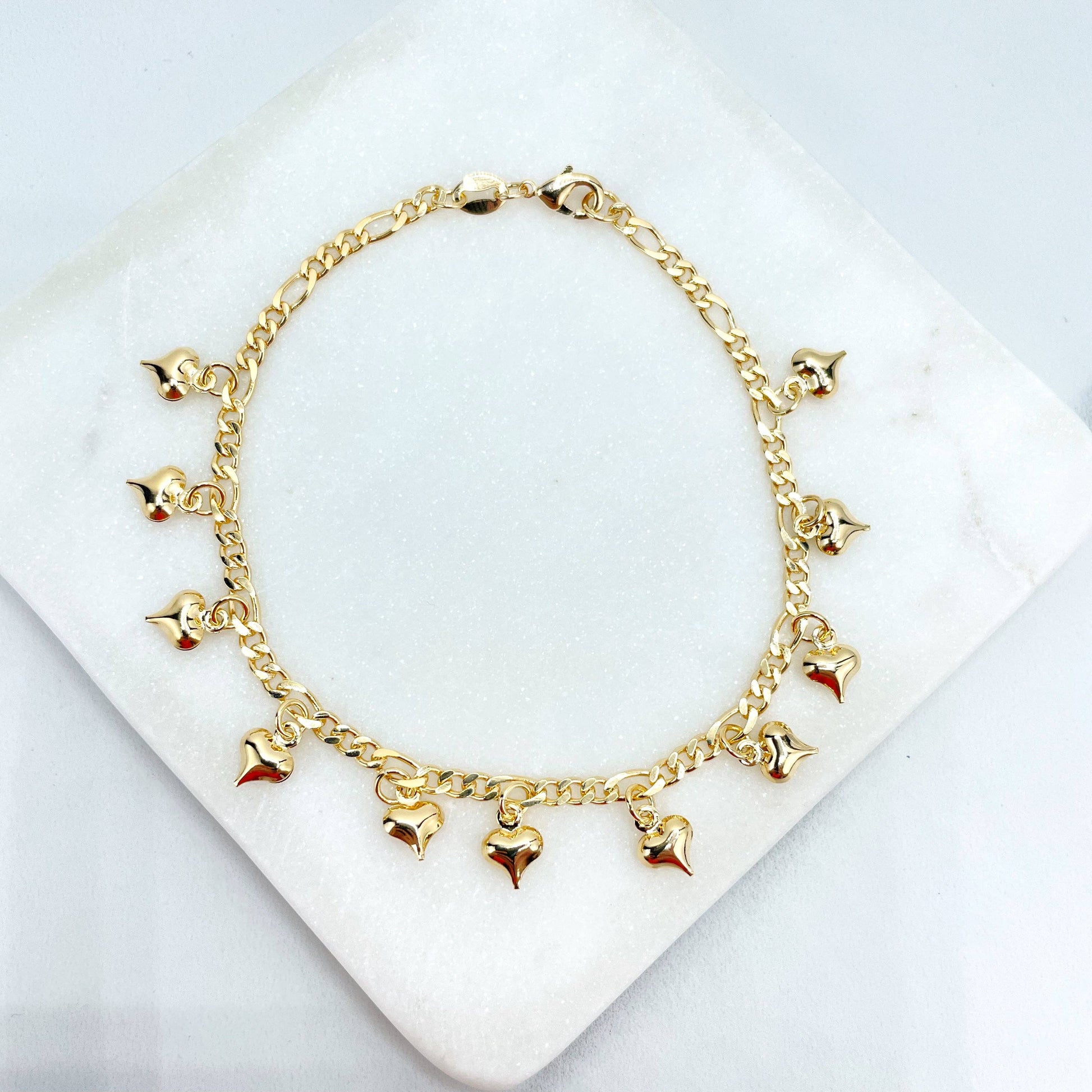 Adorn your wrist with our playful 18K Gold Filled Figaro Bracelet! This delightful 8-inch accessory features a sleek 3mm chain link design, beautifully complemented by adorable, puffed heart charms that dangle with every movement. Perfect for adding a touch of whimsy and sparkle to any outfit!