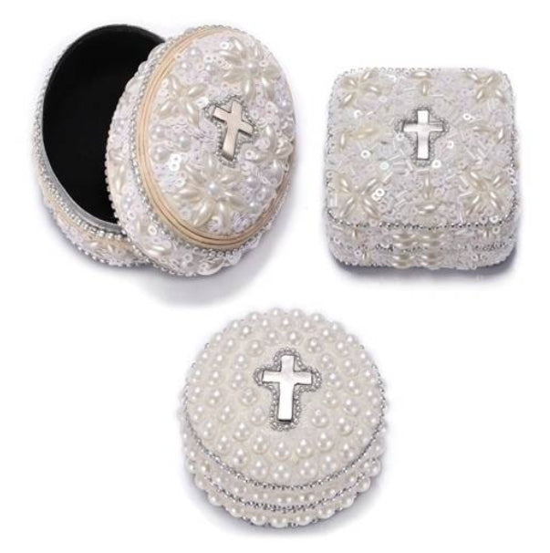 This beautiful white pearl trinket box with cross can be used to hold a rosary or special piece of jewelry or small keepsake from a special day. Great First Communion gift! Approx. 3" in size and 3 styles to choose from!