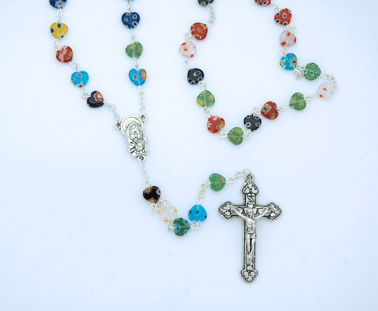 This exquisite Murano Glass Heart Rosary features delicate 8mm heart-shaped beads inspired by classic Murano craftsmanship. Each bead reflects vibrant colors and intricate artistry, making it a meaningful and beautiful accessory for prayer or personal reflection. Its unique design combines elegance with spiritual significance, perfect for those seeking a heartfelt gift or a cherished keepsake.