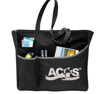 ACTS Tote bag made of a durable material with handy straps. Interior is wide open, pockets are on the outside.