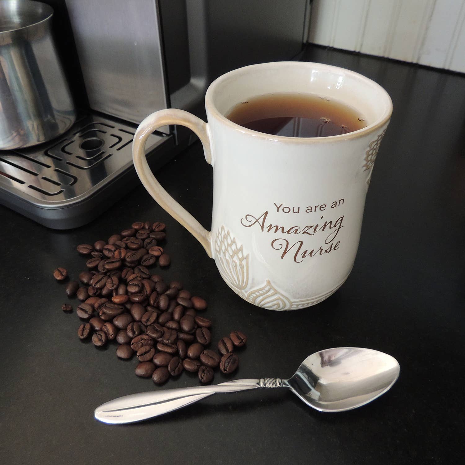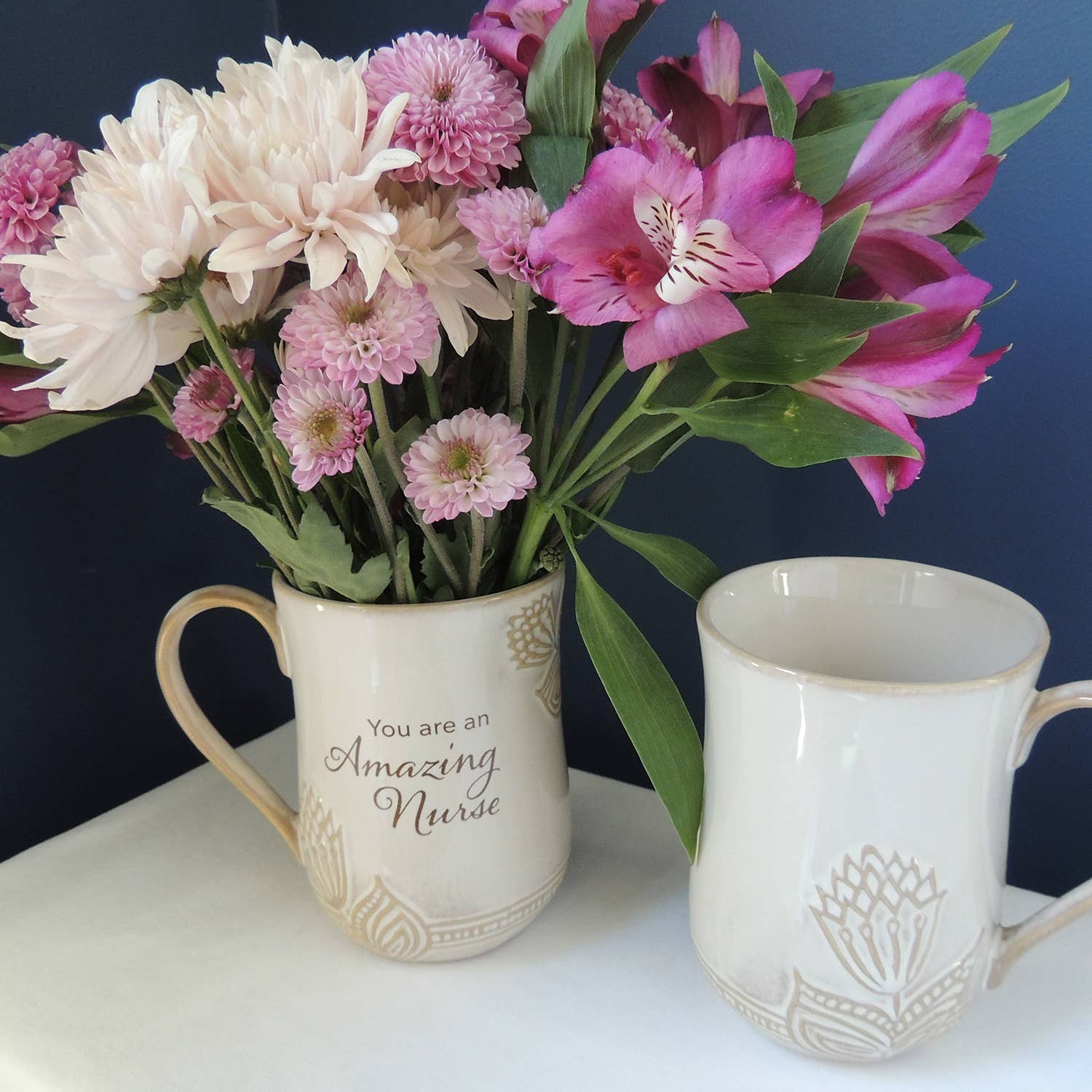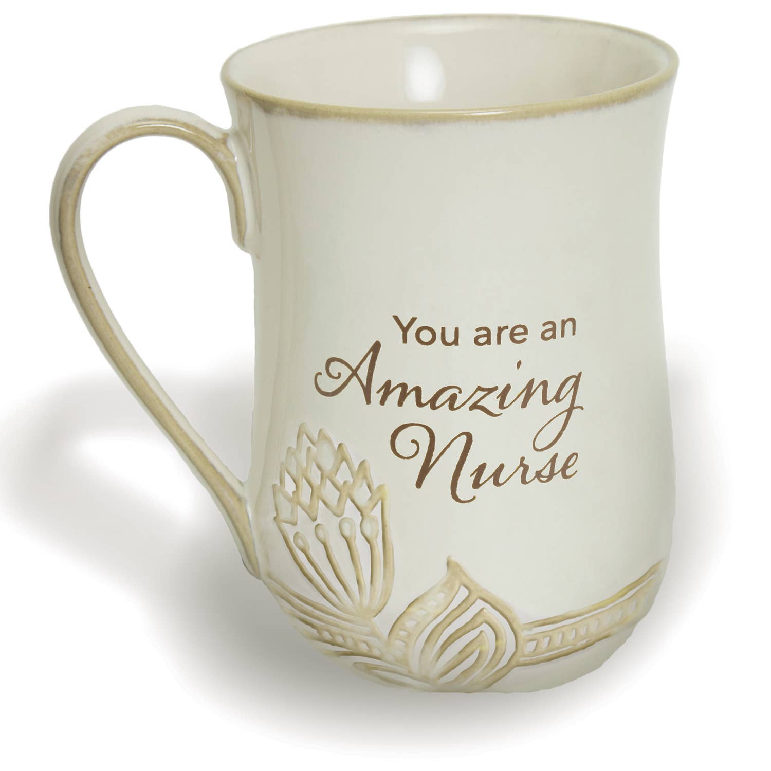 Celebrate the dedication of a special nurse with this elegant ivory pottery mug. Standing 5 ¼” tall with a 3 ½” diameter rim, it comfortably holds 16 oz of their favorite beverage. The heartfelt message, “You are an amazing Nurse,” makes it a meaningful gift that shows appreciation every day. Durable and charming, this mug is perfect for brightening any nurse’s break time.