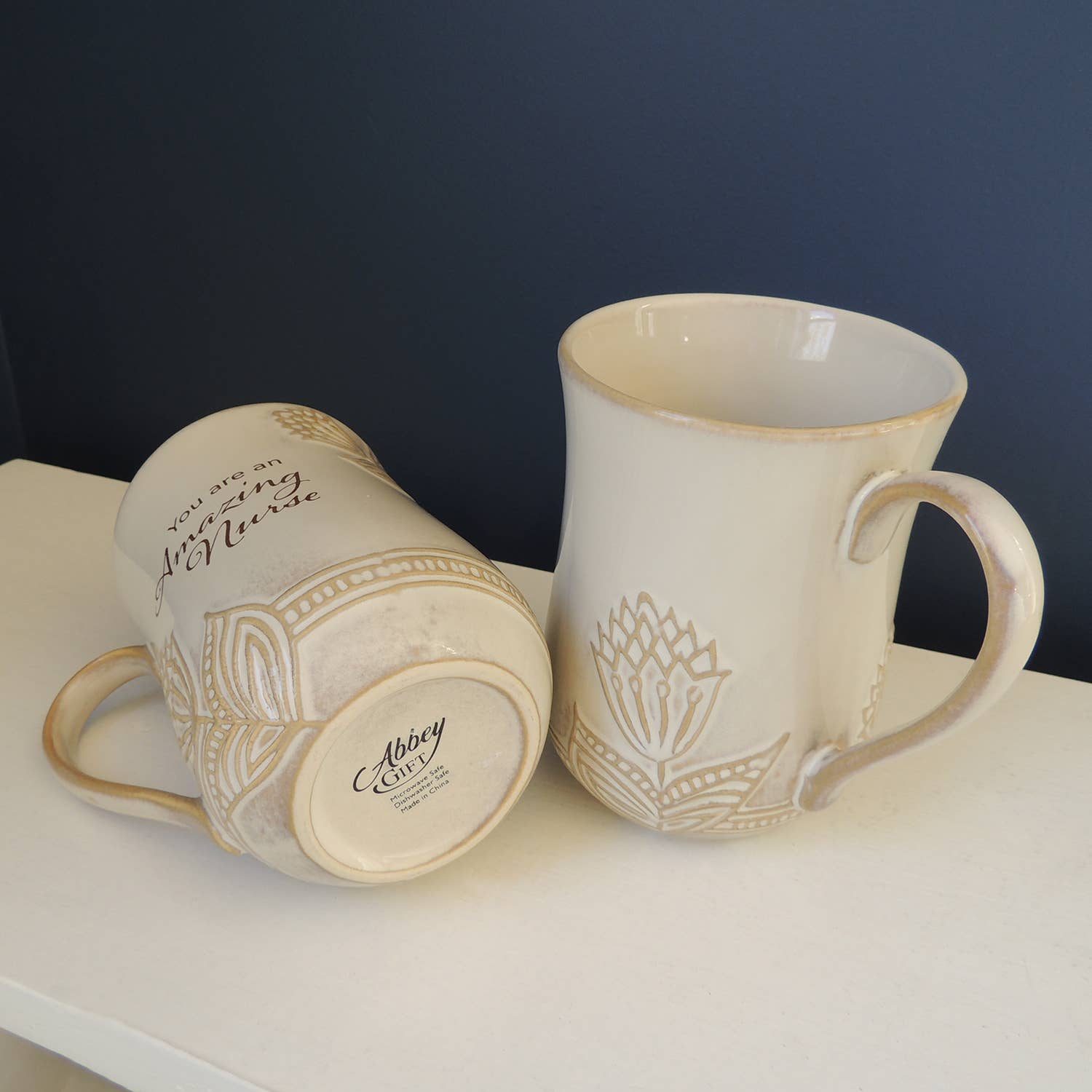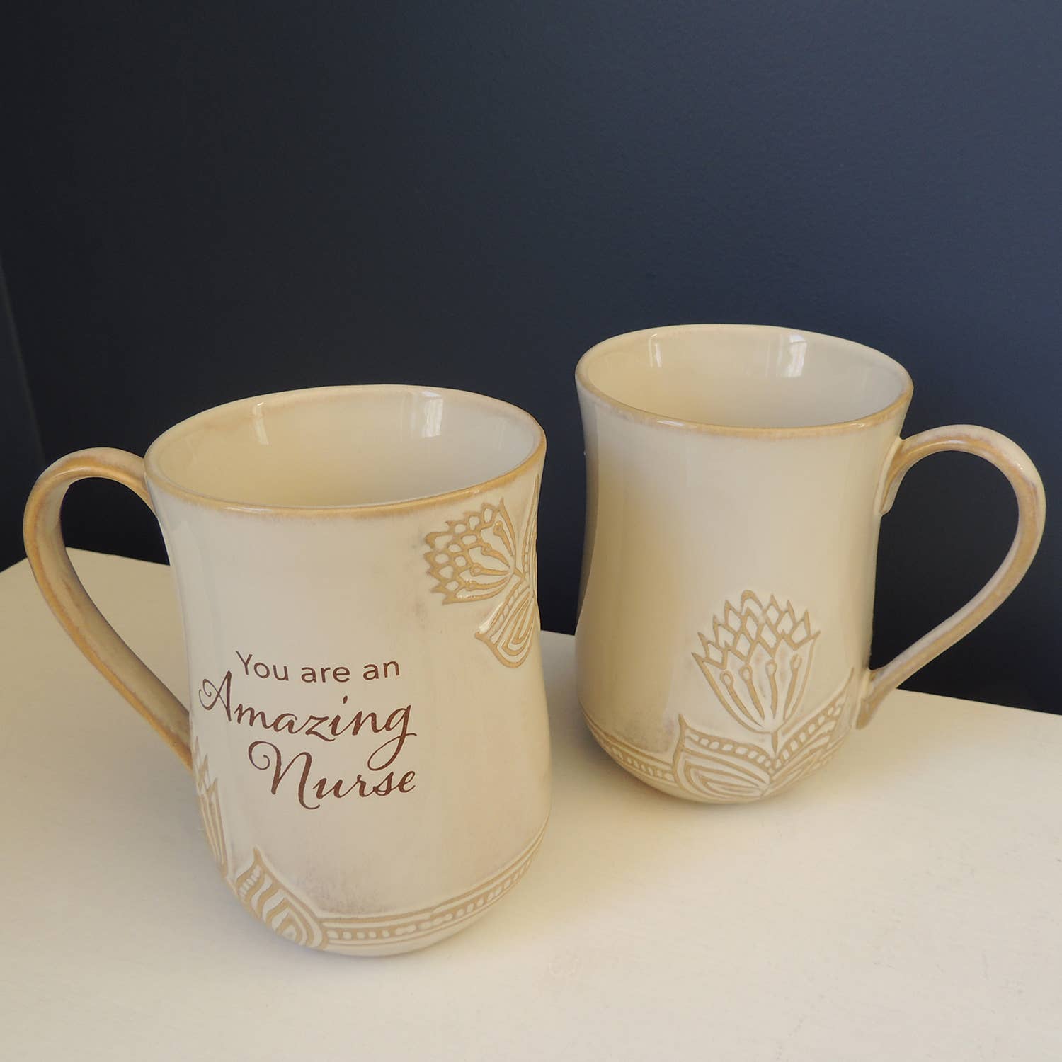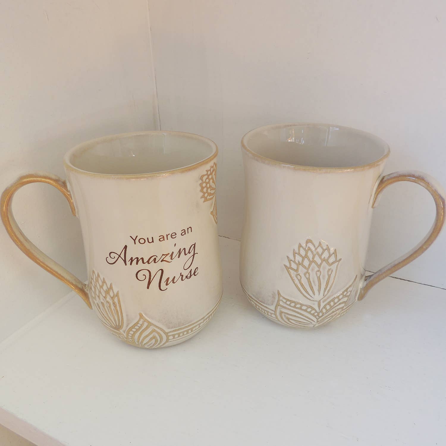 Celebrate the dedication of a special nurse with this elegant ivory pottery mug. Standing 5 ¼” tall with a 3 ½” diameter rim, it comfortably holds 16 oz of their favorite beverage. The heartfelt message, “You are an amazing Nurse,” makes it a meaningful gift that shows appreciation every day. Durable and charming, this mug is perfect for brightening any nurse’s break time.