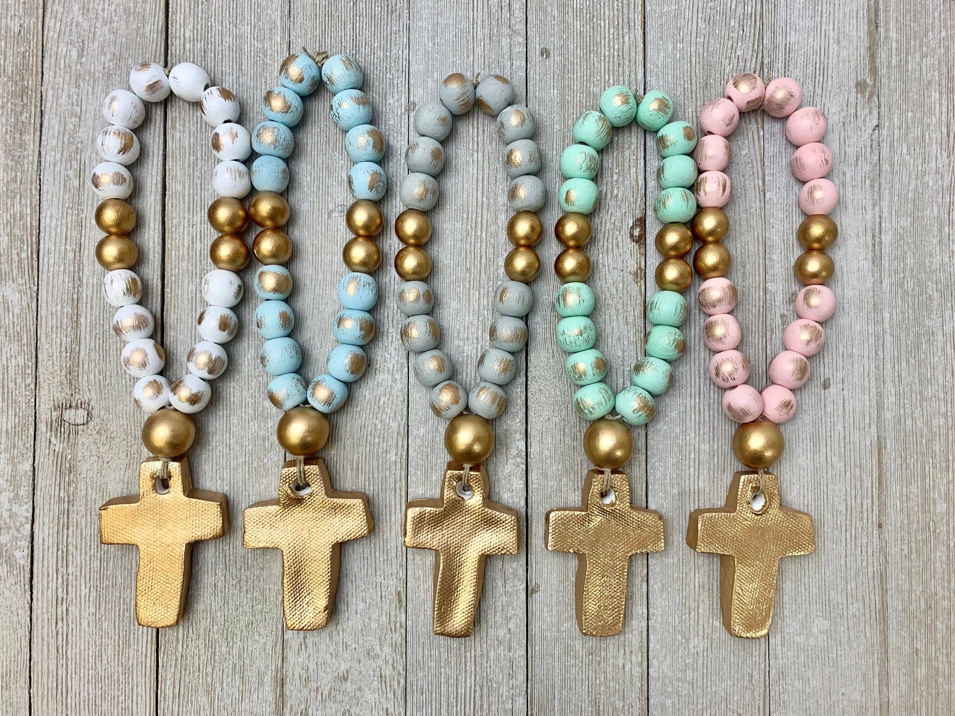 Add a touch of elegance to your home with our Door Beads. These door blessing beads made with a handmade gold clay cross and wood beads in your choice of color, serves as a year-round reminder of faith and serenity. This piece, suitable for any occasion, seamlessly blends into your decor and brings a touch of handmade charm to any space. Place on a lamp, doorknob, bookshelf, coffee table, etc! Makes a great gift for a friend or housewarming gift. Approximately 8" in length. Handcrafted in Hilton Head Island, South Carolina. Add this unique piece to your collection today!