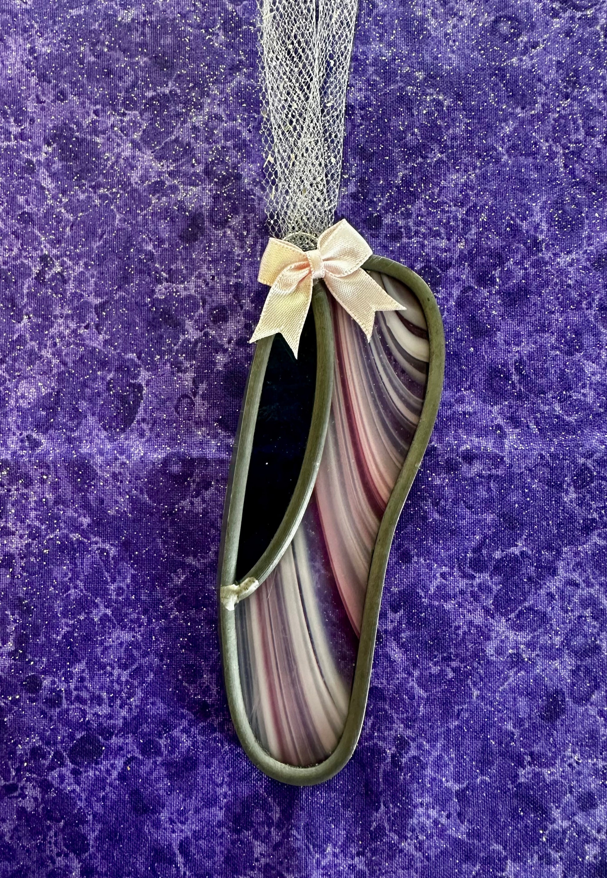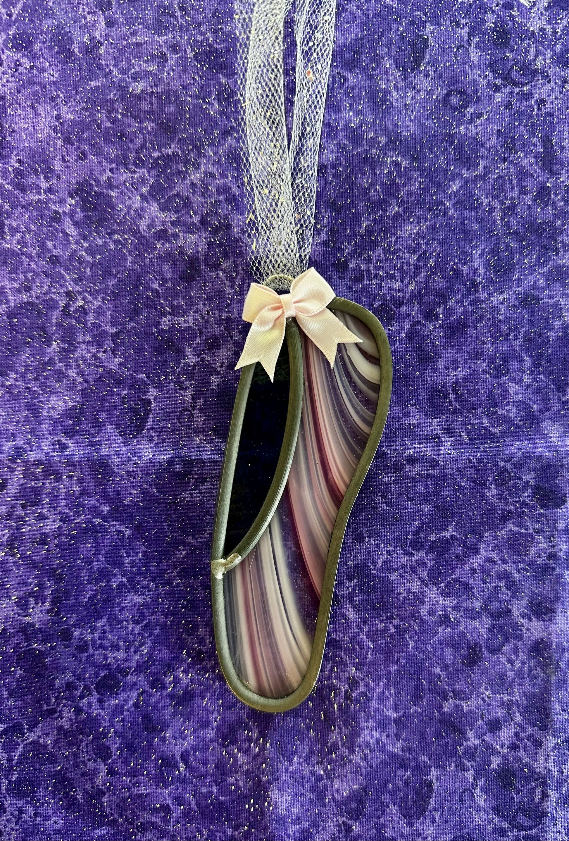 Ballerina slipper stained glass hanging. Handcrafted by a local artisan, this is a unique gift honoring your ballerina.
