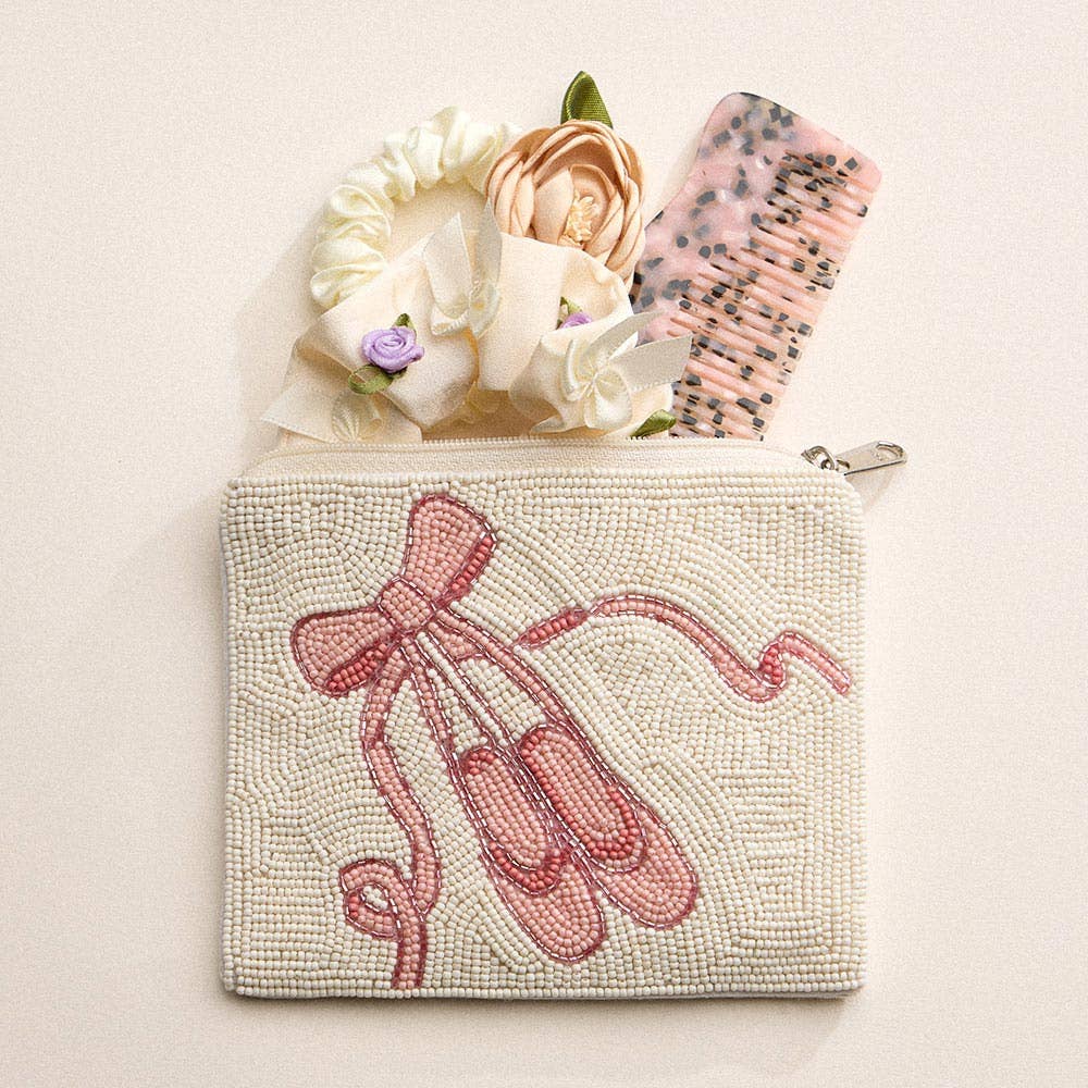 Elegant beaded pouch featuring ballet slippers tied with a bow—ideal for dancers, dance moms, or ballet lovers. A graceful accessory to store essentials or gift to someone who adores ballet style.
