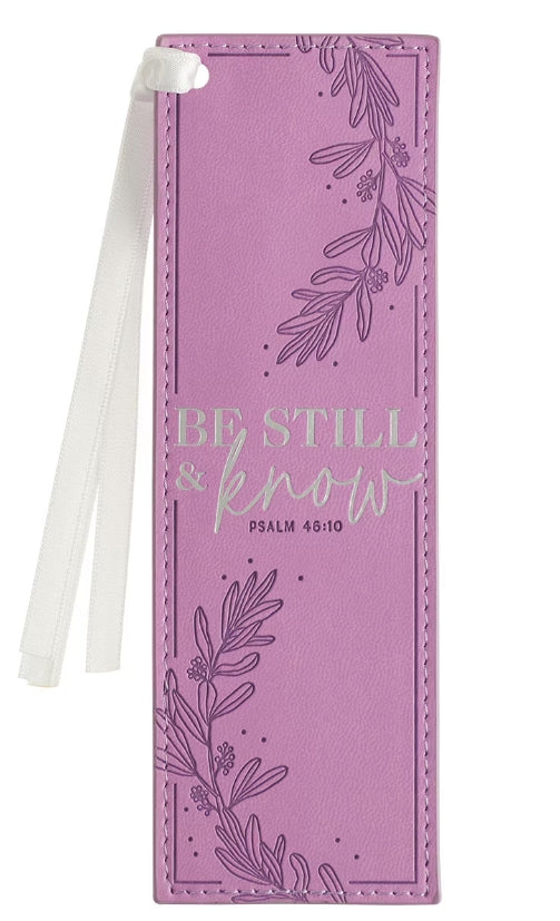 The lovely Be Still and Know Lilac Faux Leather Bookmark is paired with a peaceful message to elicit feelings of tranquility—feelings that only make sense if you believe in an Almighty God who is greater than any king or government. The bright lilac faux leather bookmark is marked by two heat-debossed laurel leaves positioned in opposite corners. The leaves are connected by a heat-debossed line that frames the design. In the center, the sentiment is shown in large silver-foiled letters. Be still & know Psalm 46:10 A pale silver knotted ribbon is attached to the top left-hand corner of the bookmark to make it easy to find your place in your book. Topstitching along the edges ensures a sturdy construction, and the scuff-resistant finish will keep the bookmark looking beautiful for years.