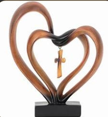 Cross with Entwined Hearts Figurine Wood Tone Finish this unique and elegant figurine shows two entwined hearts with cross dangle at center. Wonderful symbolic reminder to keep Christ at the center of your marriage. Makes an excellent wedding gift. Made of resin; height is 8 inches. Base is attached. Wood tone low gloss finish.