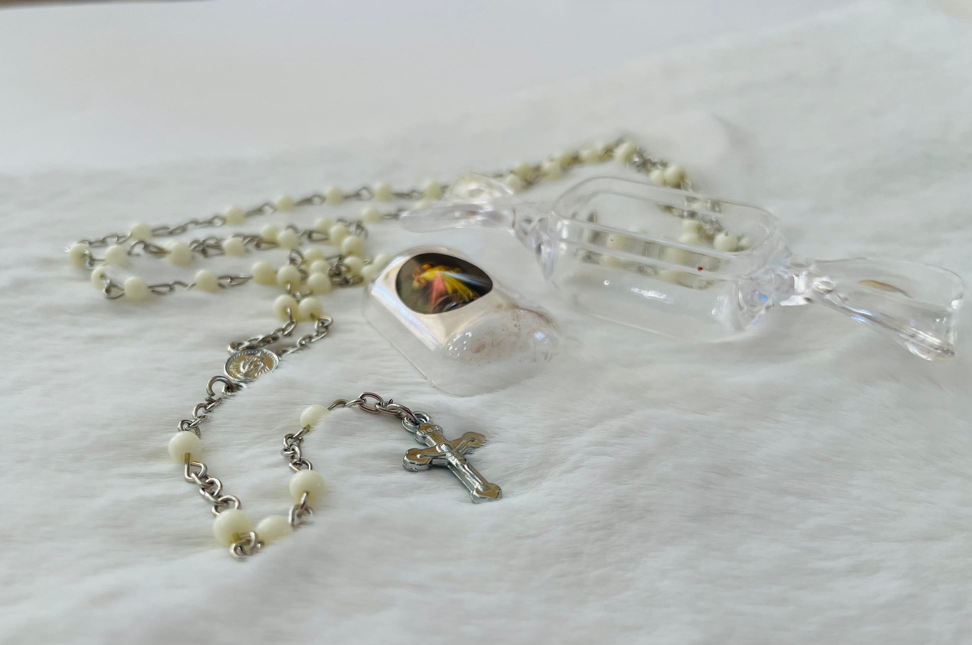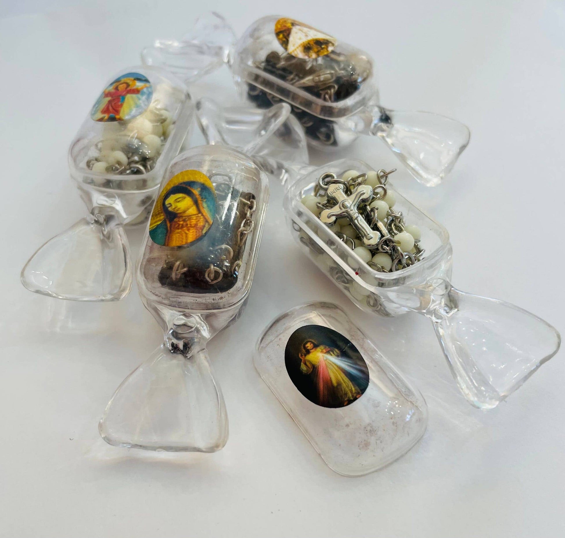Simulated see-through-candy-wrapper-packing, with a variety of colorful stickers and images of Catholic Saints. It makes a very unique gift idea for any occasion, ministry groups, confirmation students and general giveaways. 10mm beads and 18" length