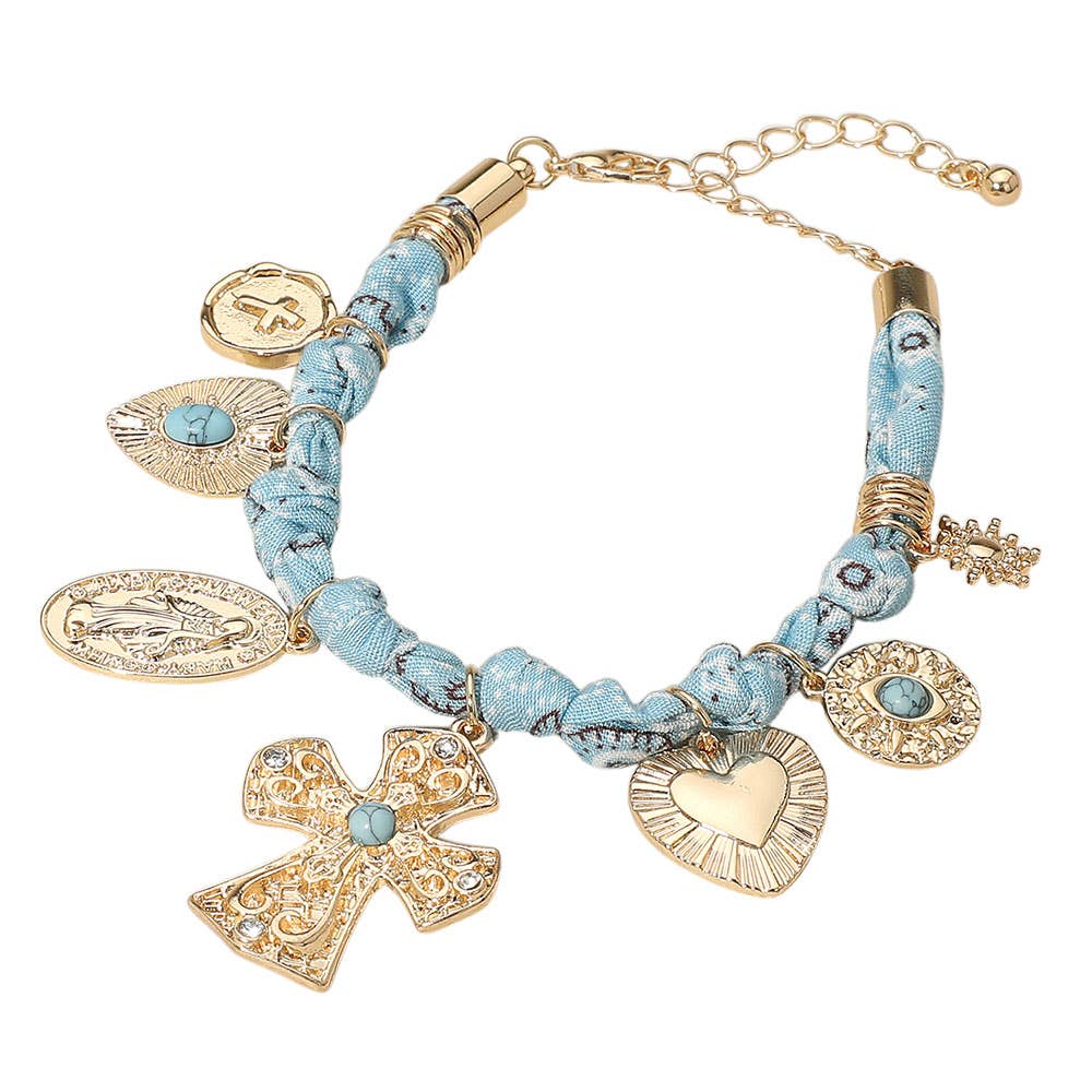 This eclectic bracelet features a mix of symbolic charms including crosses, hearts, and eye motifs on a patterned fabric band. An expressive accessory that adds layered meaning and standout detail to any outfit. Lead and Nickel Compliant. Size : 0.25" H, 7" + 2.5" L Charm Size : 1.5" L