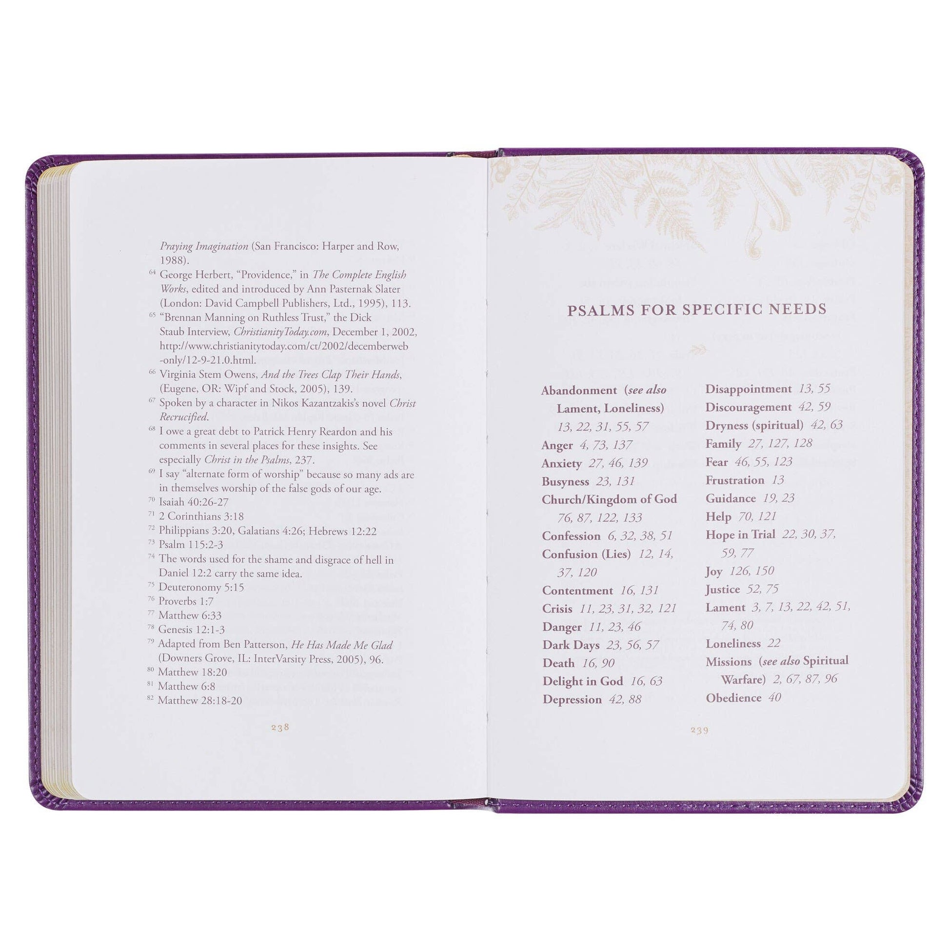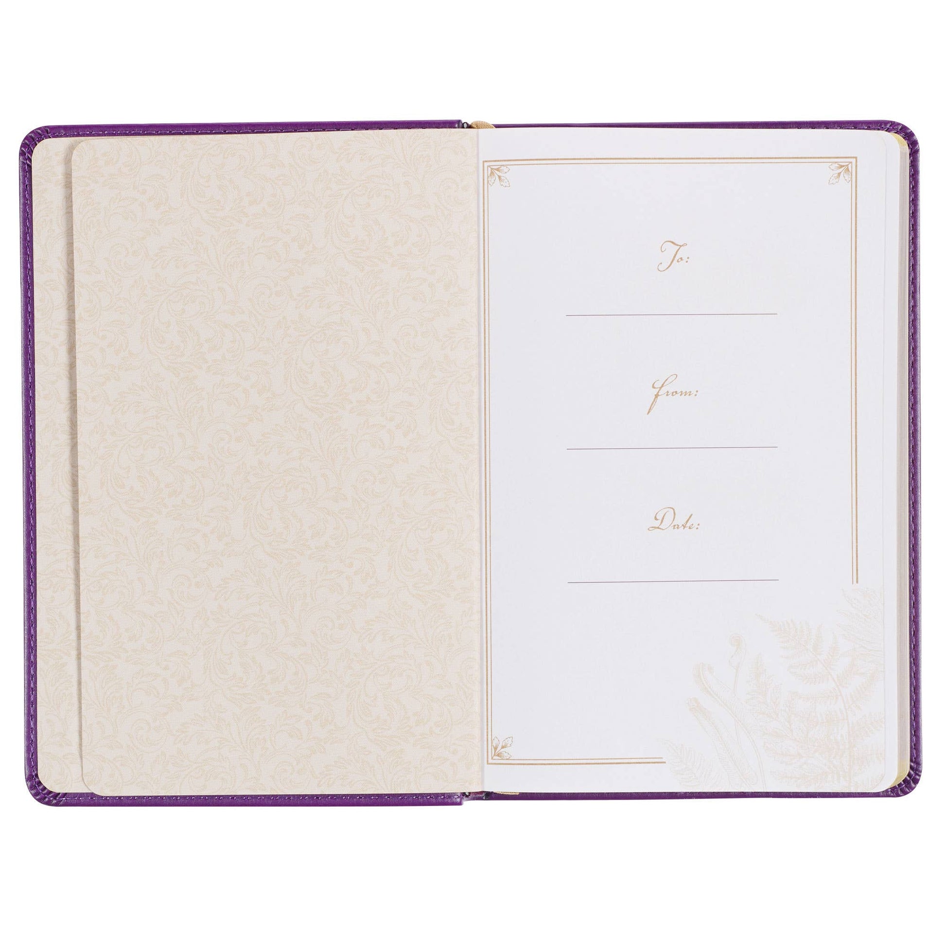 Gold-foiled fern outline cover design, Purple faux leather, Gold-foiled title, Two-color interior, 252 gilt-edged pages, 50 prayers, Size: 7.2" x 4.9" x .7" (183 x 124 x 18mm)