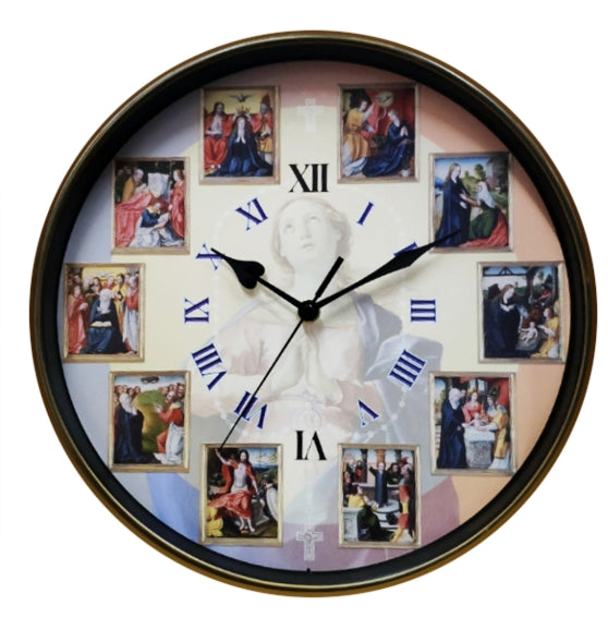 Our 12-inch Joyful and Glorious Rosary Wall Clock features ten images from old-world religious art that depict each of the five Joyful Mysteries of the Rosary and the five glorious mysteries. Use this clock as a reminder or guide to pray and meditate on the mysteries of the rosary. The Joyful Mysteries represented on one side of the clock are: