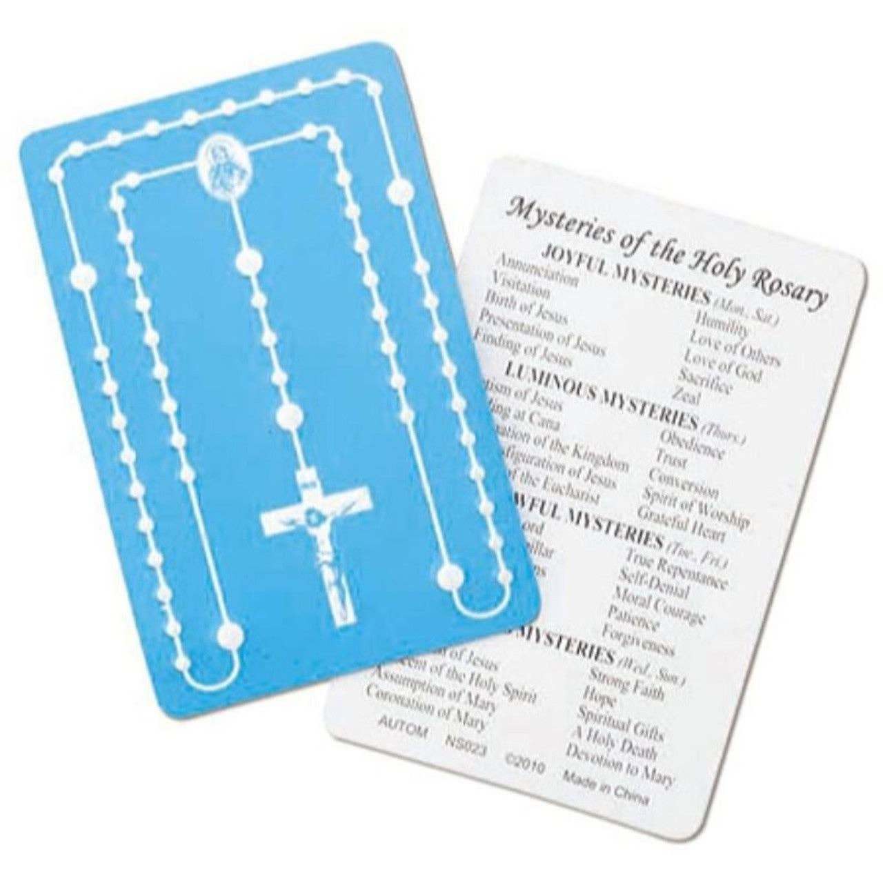 Laminated Card Stock, Embossed Rosary Card with Mysteries of the Rosary on the back. 2 1/4" wide by 3 1/2" tall.