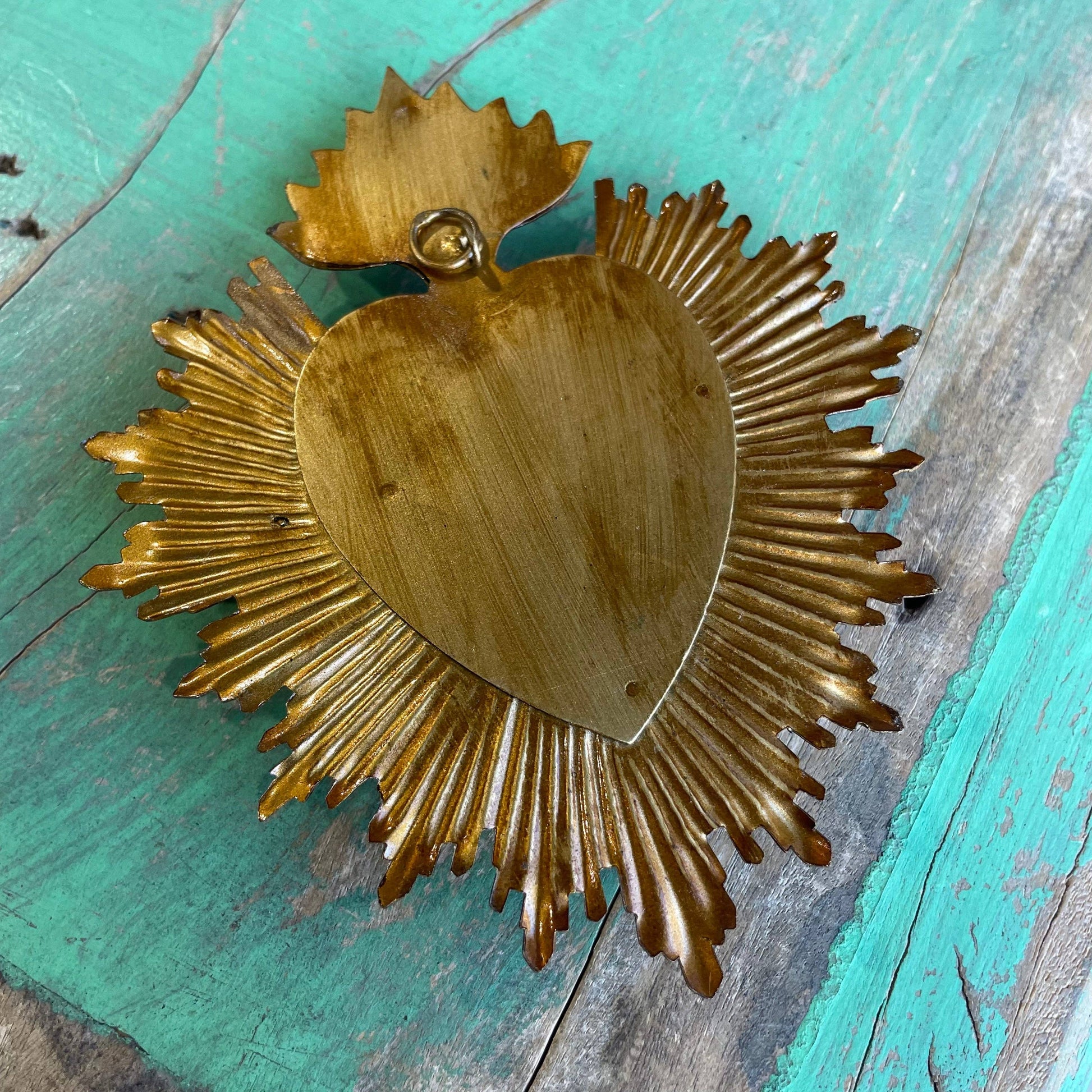 Discover the exquisite Flaming Sacred Gold Heart, a 5" x 4" devotional keepsake that combines spiritual significance with practical elegance. This beautiful flaming heart of Jesus opens to safely store your most treasured items. Perfect for holding prayer cards, rosaries, or personal mementos, this sacred piece serves as both a meaningful religious symbol and a functional decorative accent for your home altar or special space.