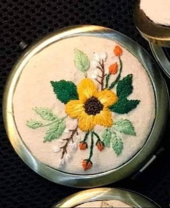 This precision-crafted compact mirror features exquisite hand-embroidered yellow flower designs on premium linen. The 70mm diameter stainless steel construction ensures durability while maintaining elegance. Each mirror arrives in a complementary floral pouch, providing both protection and presentation value. An ideal gift selection for the discerning woman, whether for special occasions or as a thoughtful everyday accessory.