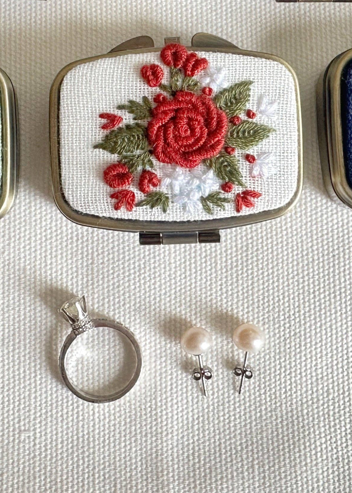 Red Rose Floral Embroidered Linen Mini Jewelry Box with Mirror that measures 2.2 x 1.8 inches with two compartments. A stunning fusion of elegance and functionality, crafted with meticulous attention to detail, this jewelry box is designed to safeguard your precious treasures while adding a touch of sophistication to your dressing table or vanity. Featuring a charming floral embroidery on high-quality linen fabric, each intricate stitch showcases the craftsmanship and artistry behind this beautiful piece. The delicate floral motif adds a timeless allure, making it a perfect accent for any décor style, from classic to contemporary.