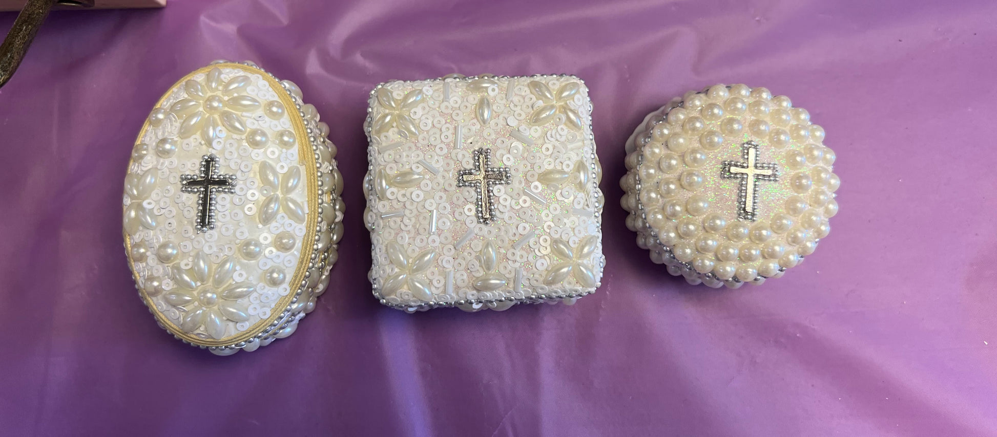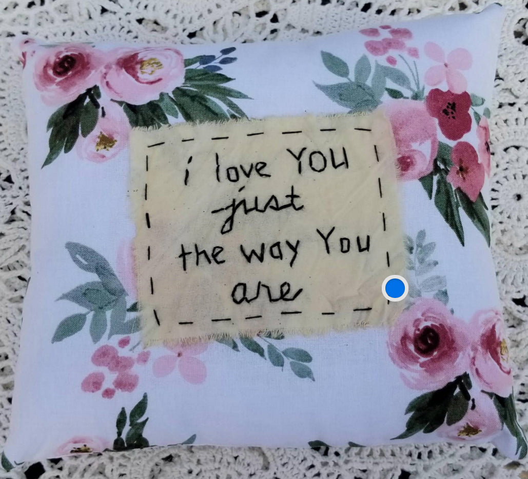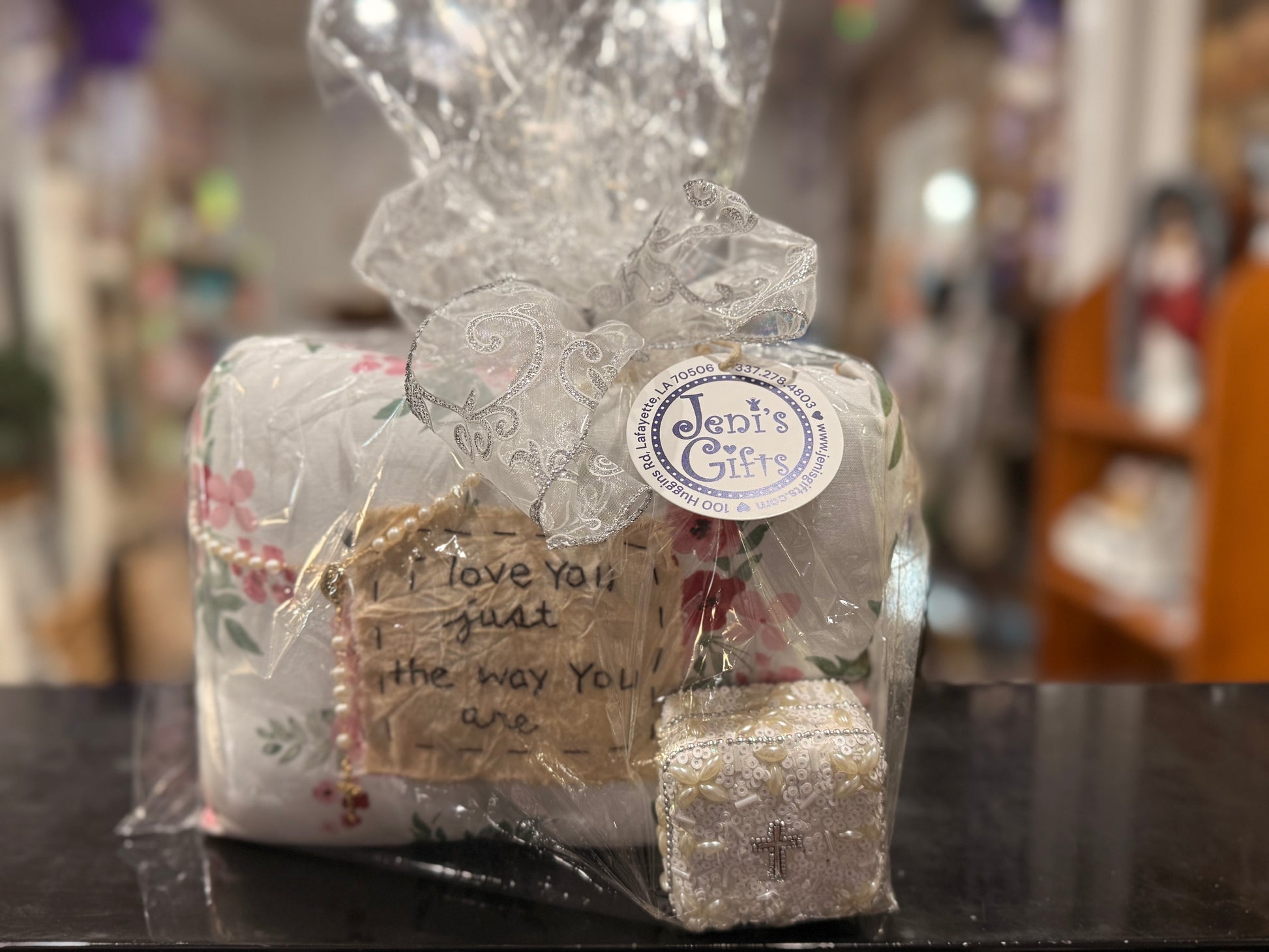 Rosary, keepsake box & I Love you just the way you are pillow lovingly joined in a gift basket.