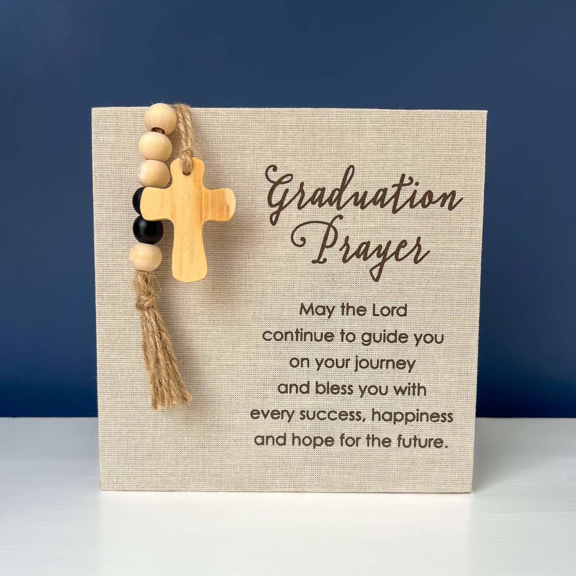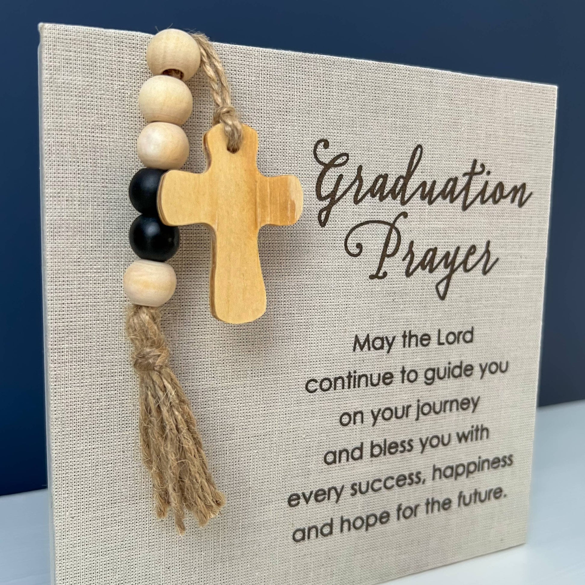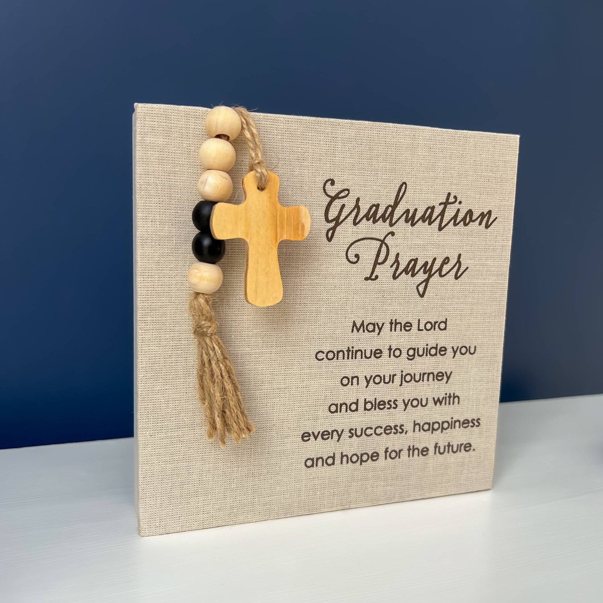 Graduation Prayer Plaque. Crafted of MDF wrapped in fabric. Adorned with jute, wood cross charm and beads. Ready to hang or stand. 6” x 6”