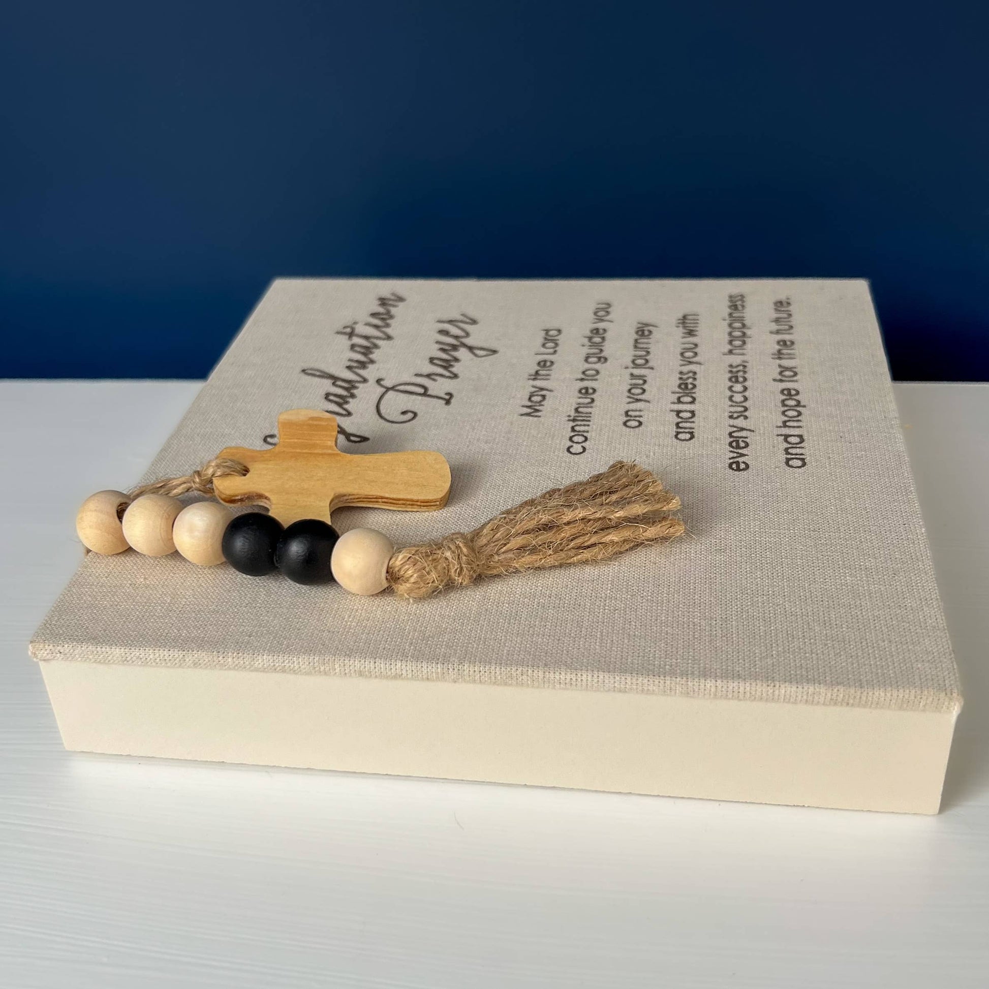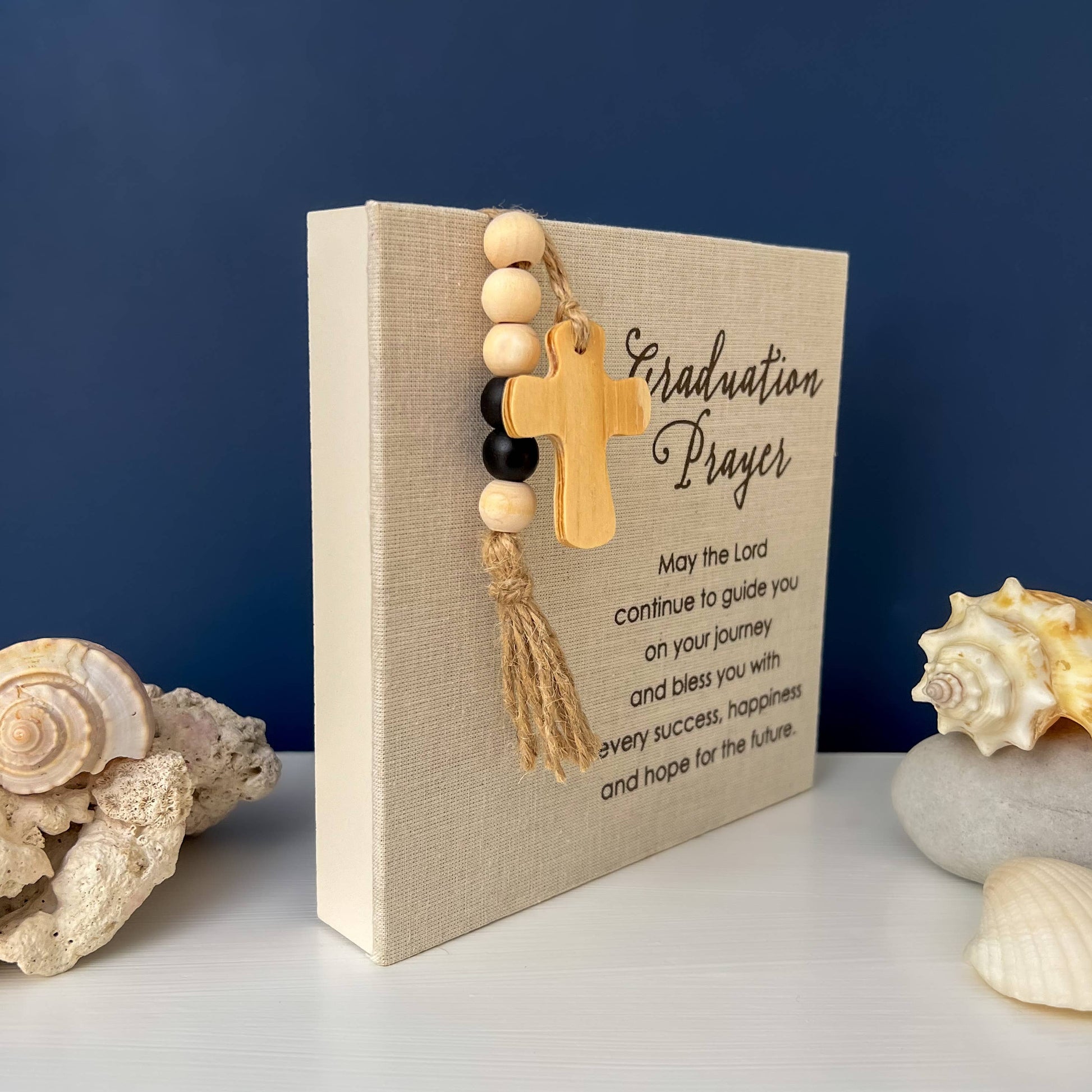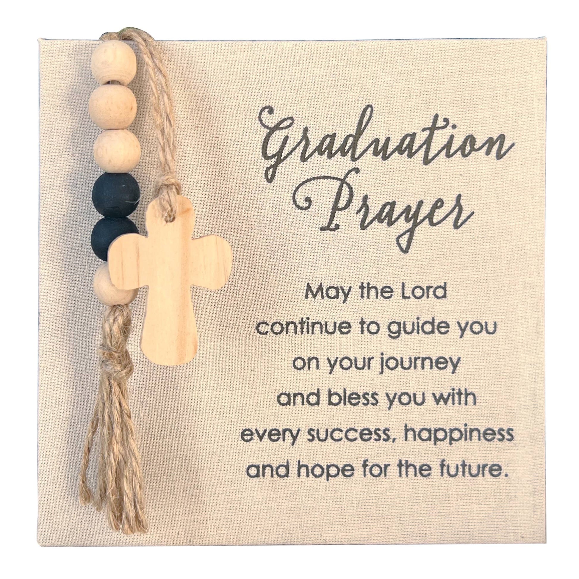 Graduation Prayer Plaque. Crafted of MDF wrapped in fabric. Adorned with jute, wood cross charm and beads. Ready to hang or stand. 6” x 6”