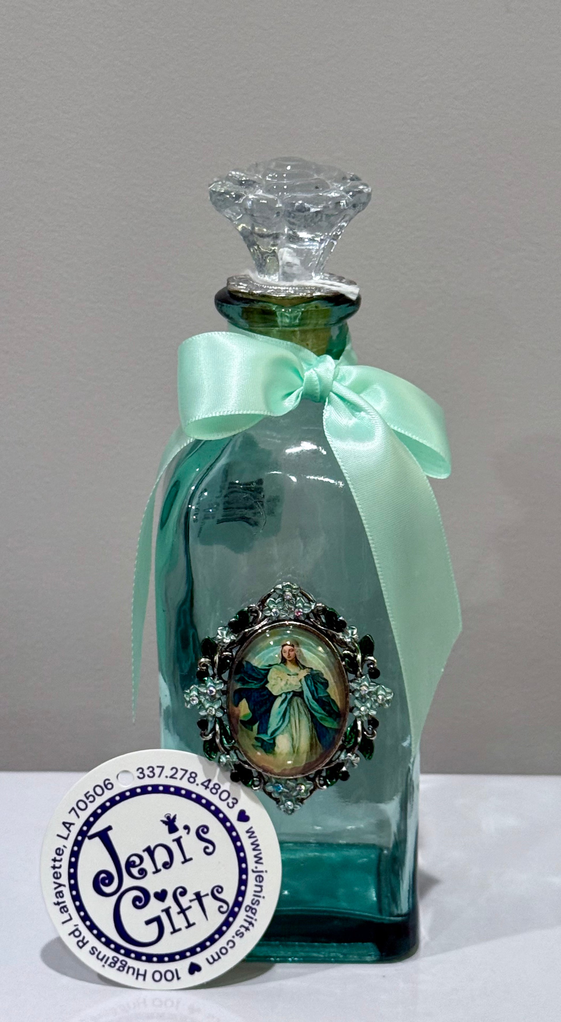 Holy Water Bottle in Light Green, Our Lady of Grace stands 8.5” tall, transparent glass bottle with bow and elegant topper.