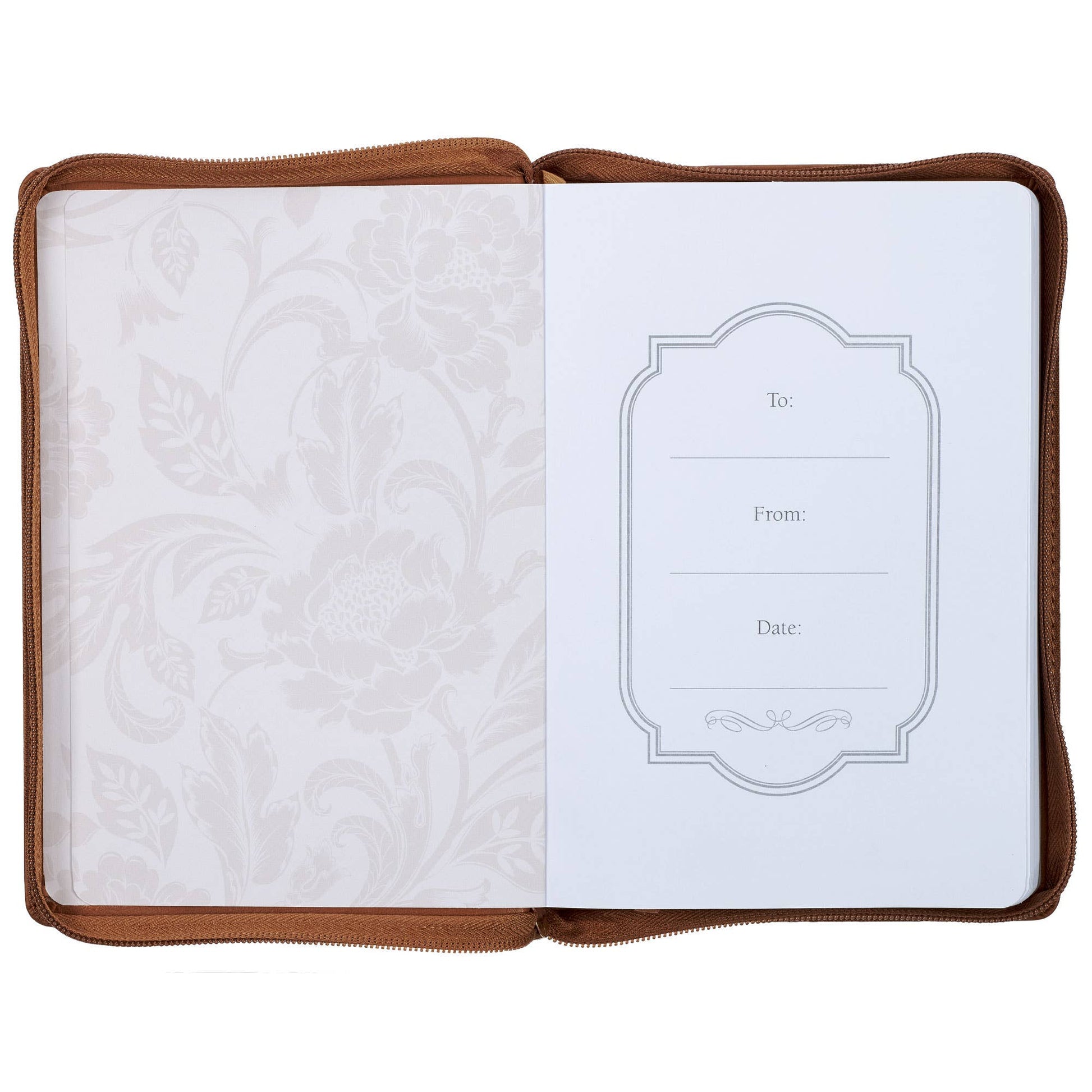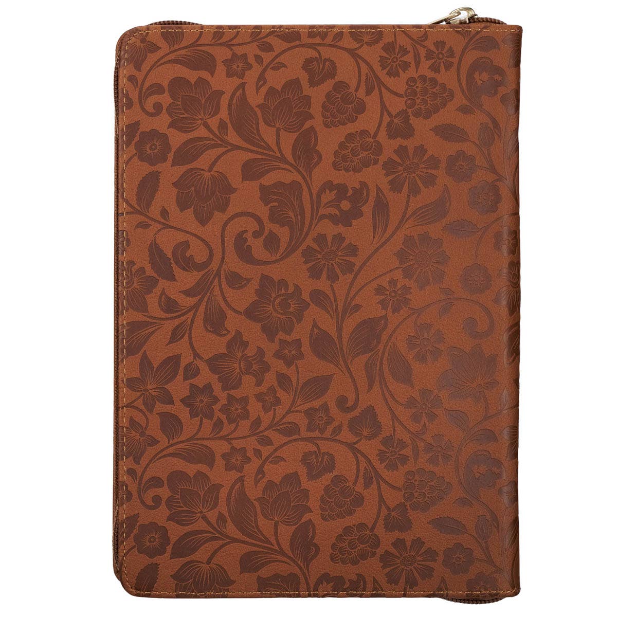 Heat-debossed floral vine design, Honey-brown faux leather, Gold-foiled text, I can do all things through Christ who strengthens me, Philippians 4:13, Trust Honey-brown and Navy Floral Collection, Classic journal, Zippered closure, Flexcover, Presentation page, Ribbon marker, 336 lined pages, Scripture on each page, Size: 9" x 6.4" x .9" (229 x 163 x 23mm)