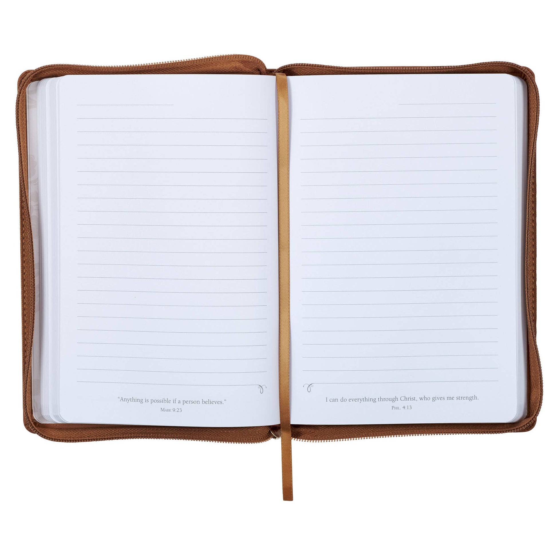The I Can Do All Things Through Christ Honey-brown Faux Leather Classic Journal with Zipper Closure is a thoughtful and uplifting gift that can be a source of inspiration and comfort. It carries a profound message: contentment can be found in all circumstances.