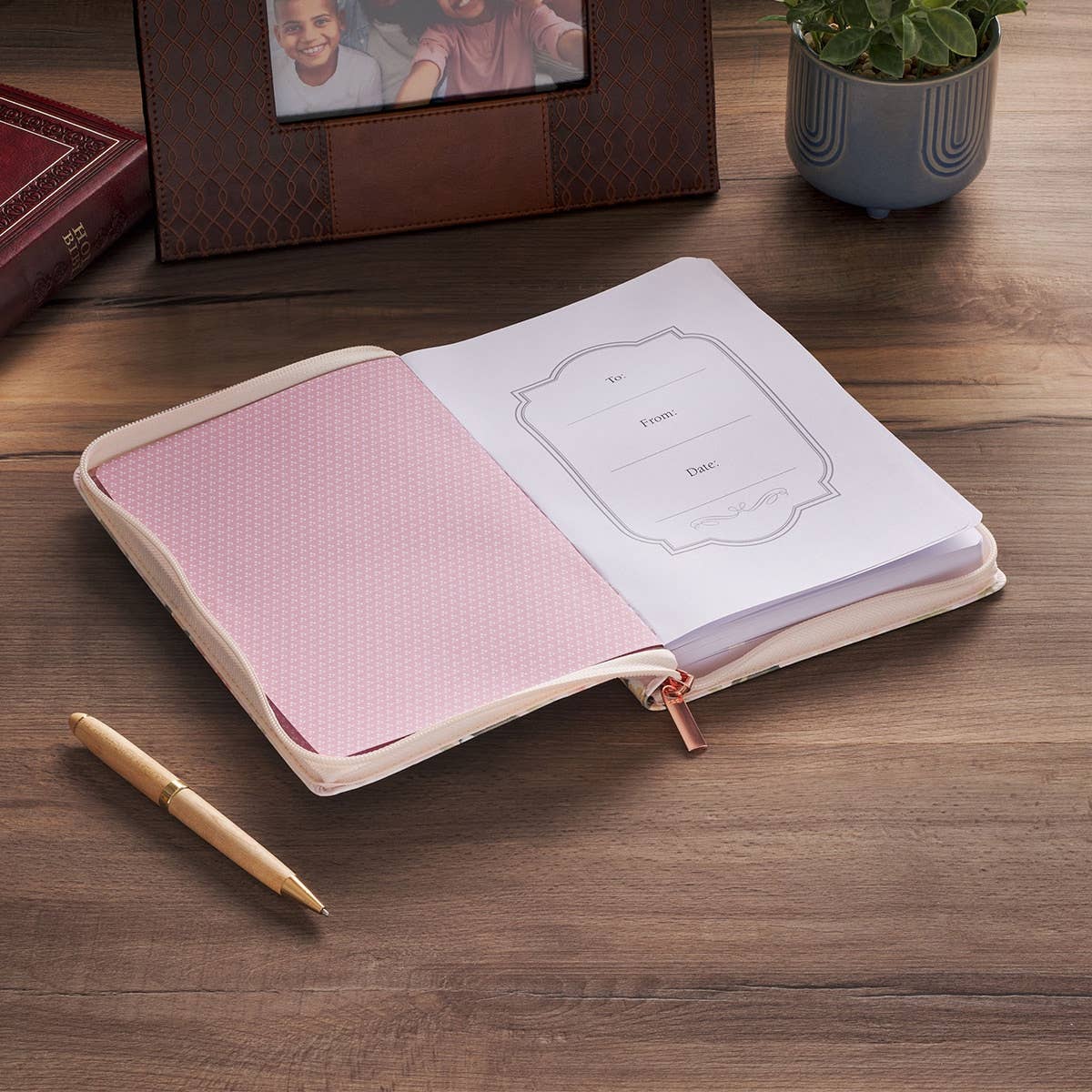 Bright floral cover design, Pink background, Gold-foiled text, Strength and honor are her clothing and she will rejoice in time to come., Proverbs 31:25, Margo Collection, Artwork by Allison Loveall, Flexcover, Zippered closure, Gold metal zipper pull, Ribbon marker, 336 lined pages, Presentation page, Scripture on each page, Size: 9" x 6.4" x 0.9" (229 x 163 x 23mm)