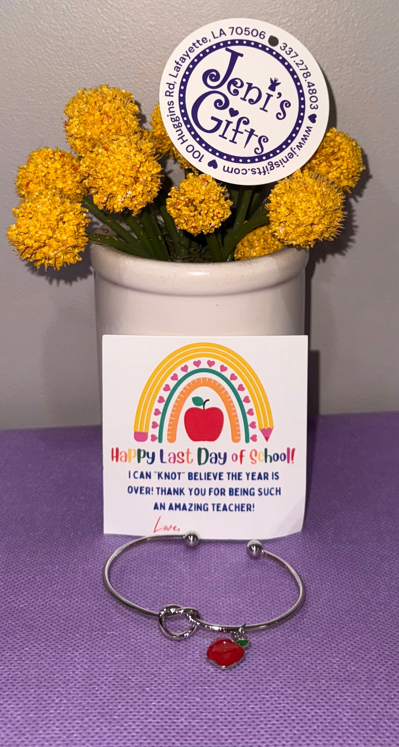 Knot Bracelet with apple charm in silver tone perfect for any teacher on the last day of school.