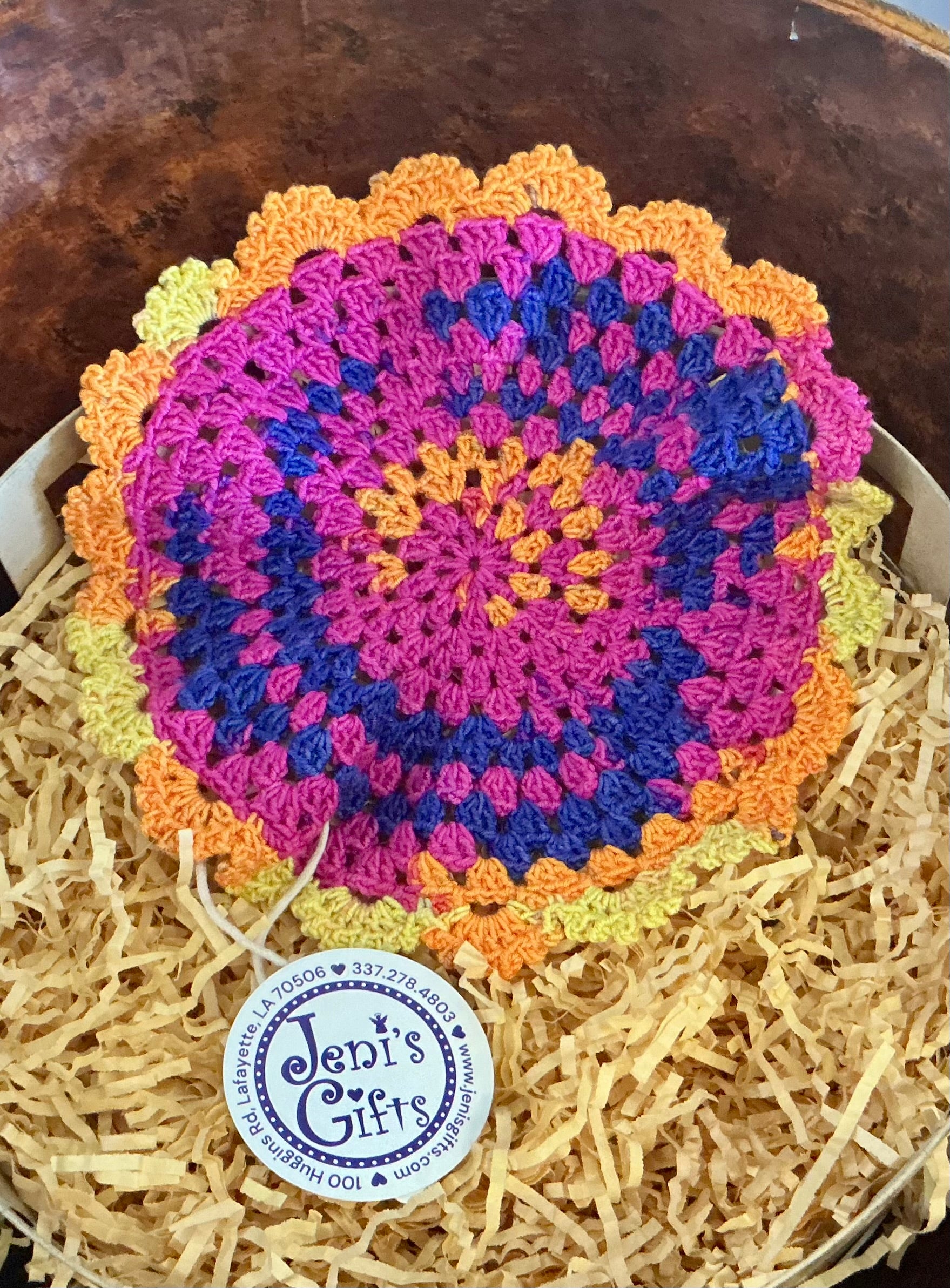 This handcrafted large doily has been lovingly crocheted by Toot with meticulous attention to detail. The intricate pattern adds a touch of elegance to any table setting or furniture piece. Perfect as a decorative accent or thoughtful gift for someone who appreciates handmade treasures.