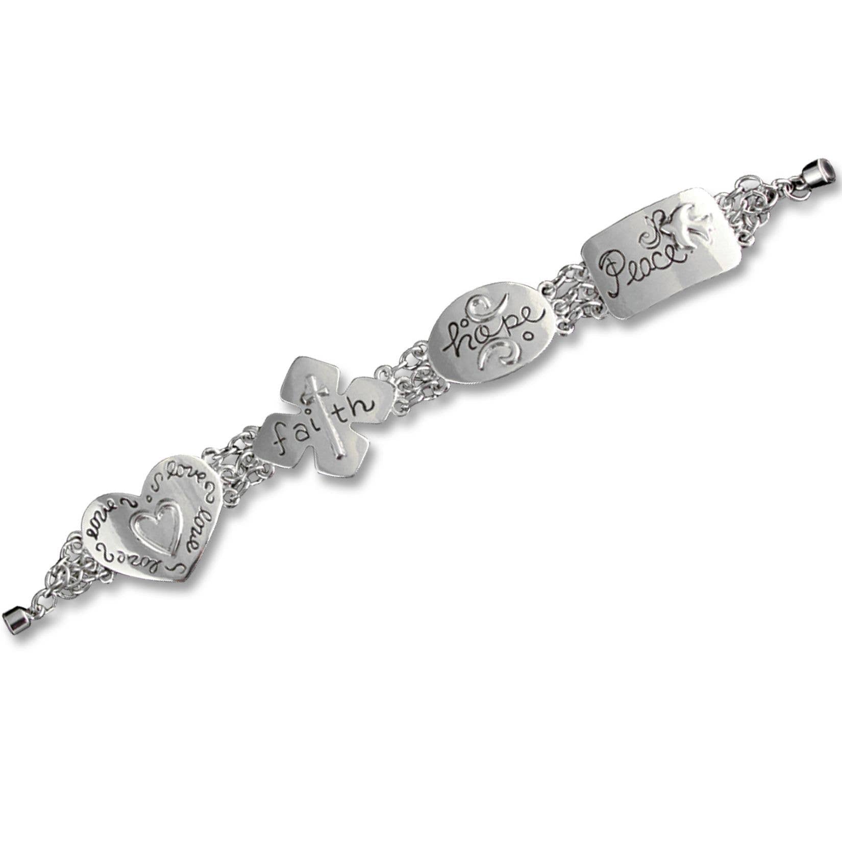 Chain bracelet with magnetic clasp featuring Love, Hope, Faith, and Peace charms, made of genuine pewter. Wear on your wrist to remind you of the meaningful sentiments of the charms at all times. 6 ½” long.