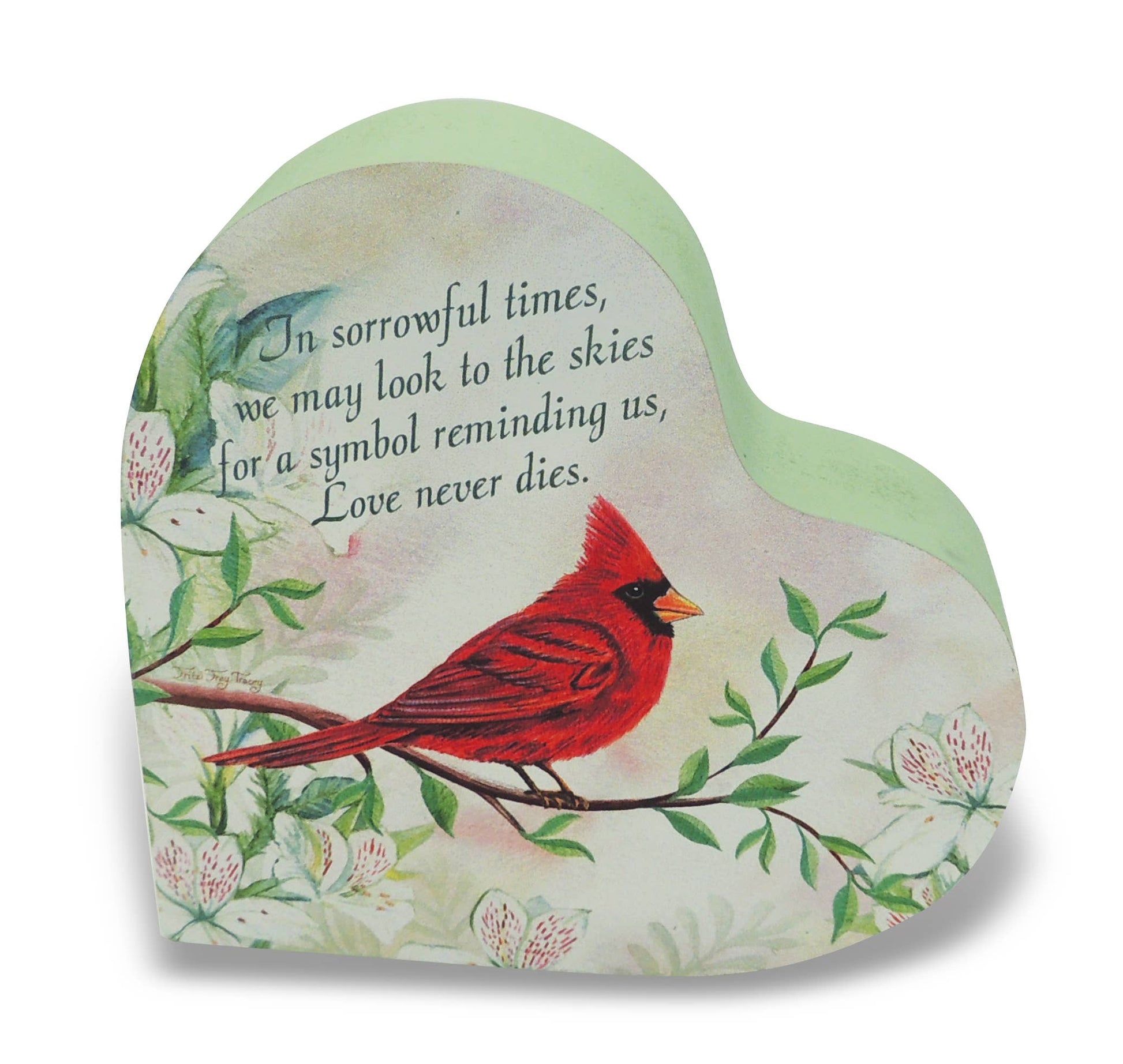 Two sided MDF heart in soft pastel tones, featuring the cardinal, a symbol of love with heartfelt sentiments.