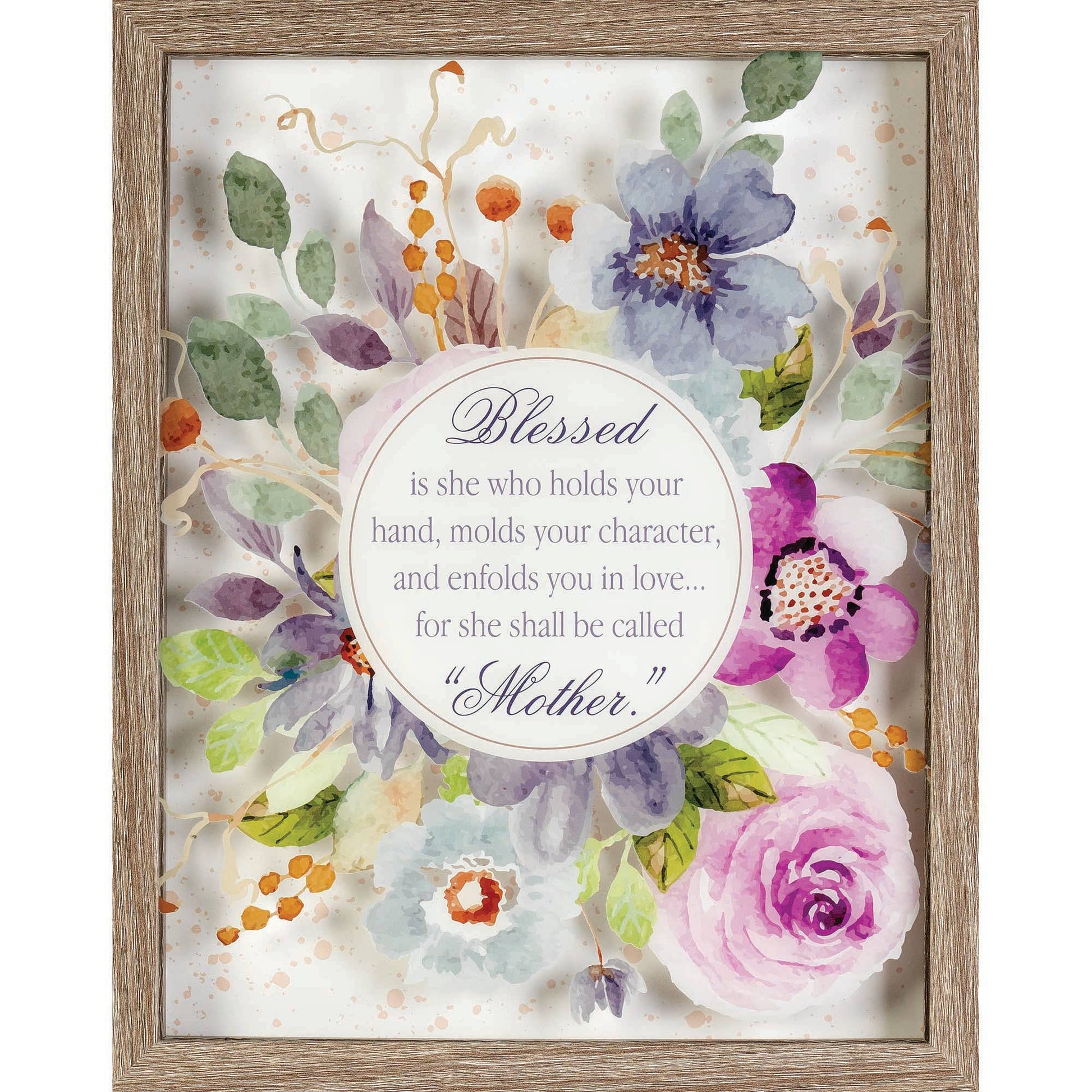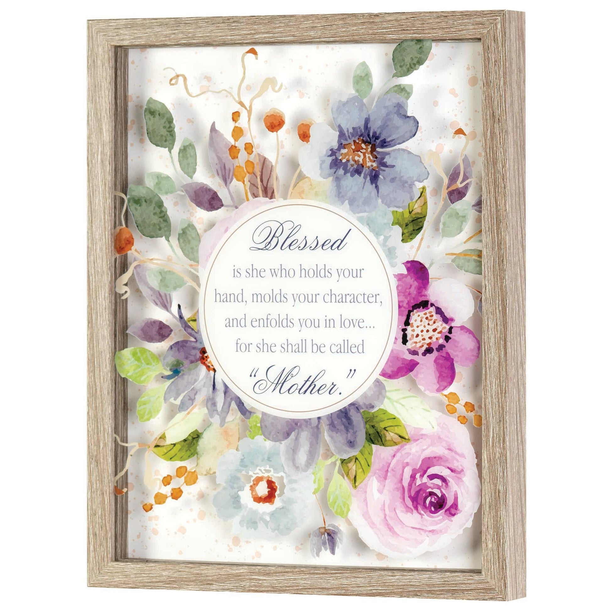 Gorgeous floral print accompanies a tribute to Mom on this wall decor piece: Blessed is she who holds your hand, molds your character, and enfolds you in love for she shall be called "Mother." Words and flowers are on the underside of glass that's raised 3/4" above the speckled background print. Frame is wood with woodgrain design finish; outer frame size is 9" x 11" x 1 1/4". Print and glass size is 8" x 10". Hanger and pull-out easel on back for wall or tabletop display. Assembled in the US of imported materials.