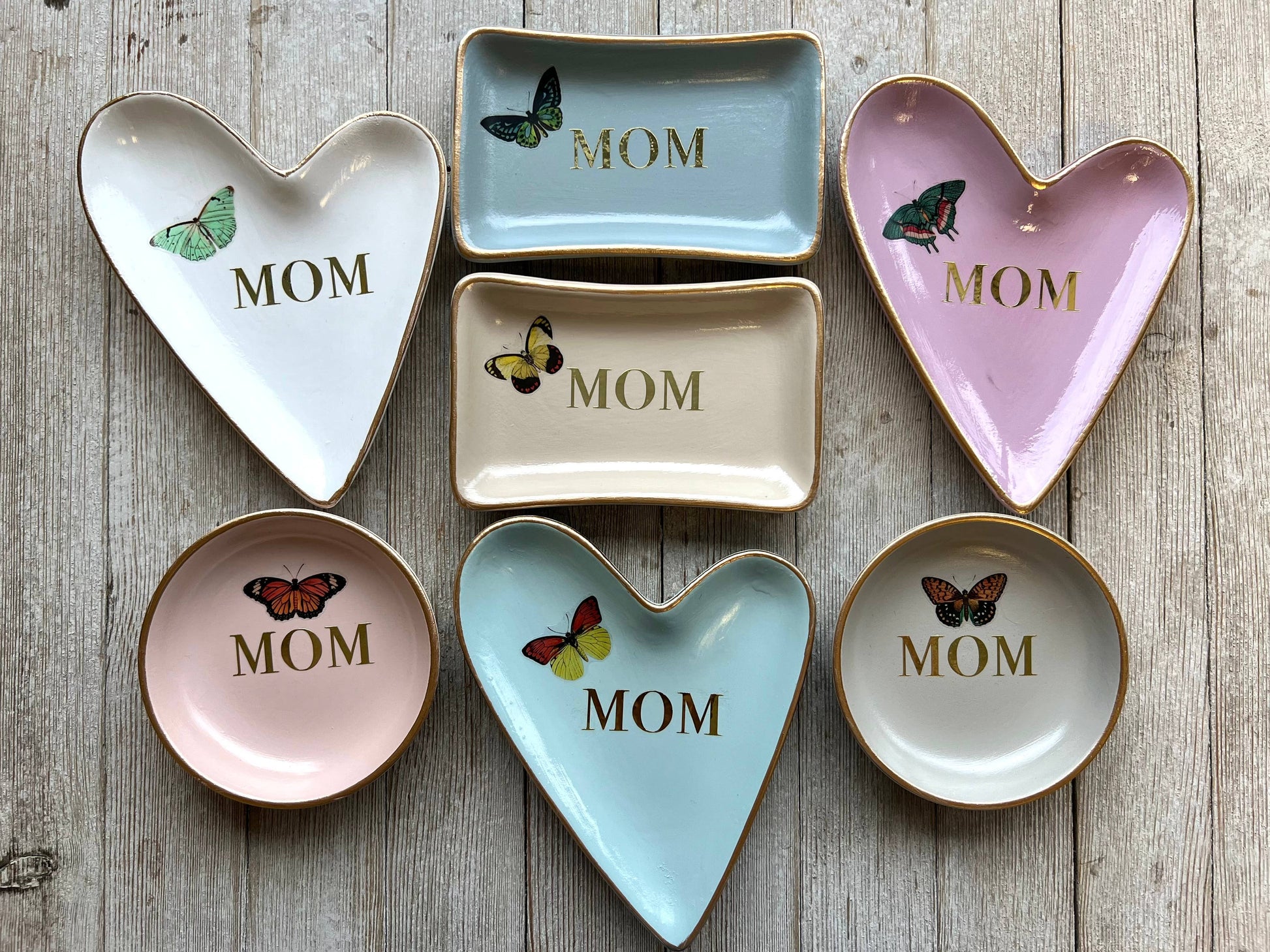 This decorative Mom Heart Jewelry Dish features elegant pink/gold letters and a delicate butterfly design, making it the perfect gift for any mother. Show your appreciation with a special place for her jewelry.