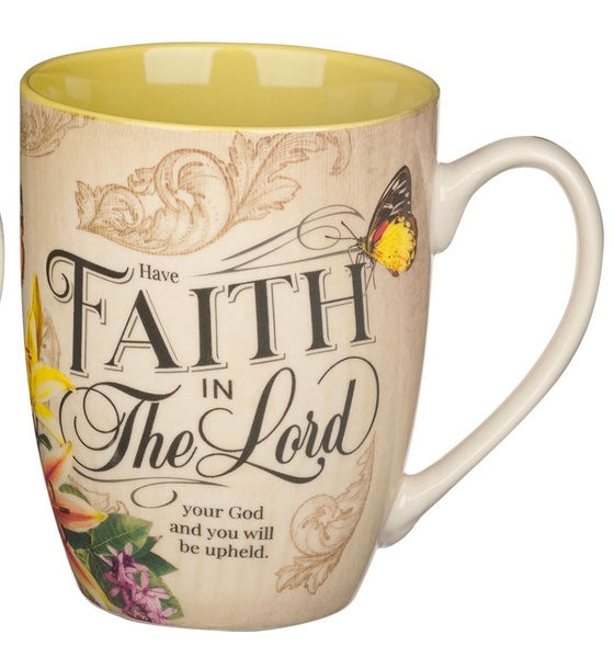 This premium ceramic mug showcases the powerful message "Have Faith in the Lord your God and you will be upheld " in elegant lettering. Crafted with superior heat retention properties, it keeps beverages at optimal temperature while its ergonomic handle ensures comfortable grip. The durable glaze maintains its pristine appearance through repeated use, making it an ideal companion for daily reflection. 2 Chronicles 20:20 printed on the reverse side, with green inner cup color.