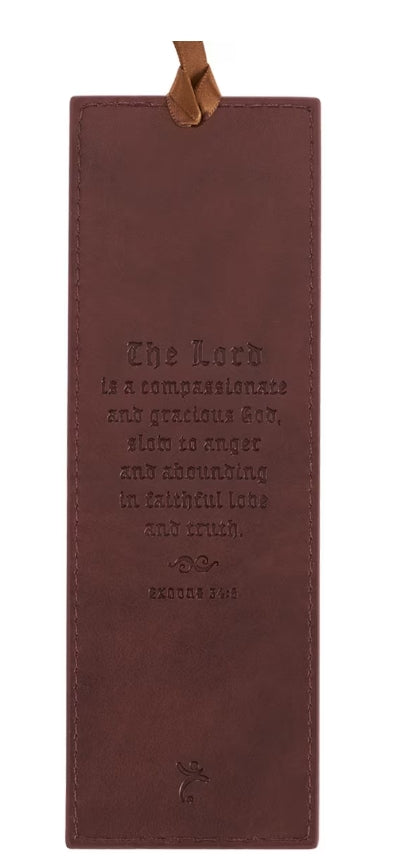 Use the Names of God Brown Faux Leather Bookmark to mark your place and to remind you of the multifaceted character of God. Heat-debossed into the smooth brown faux leather of the bookmark and printed in a gothic-style font are the names of God used throughout Scripture offered in English and Hebrew. Within a decorated heat-debossed diamond shape at the center sits God's statement from Exodus. I am who I am Brown topstitching borders the edges of this bookmark, and a light brown ribbon is tied at the top. The back of the bookmark is heat-debossed with a supporting verse from Exodus. The Lord is a compassionate and gracious God, slow to anger and abounding in faithful love and truth. Exodus 34:6