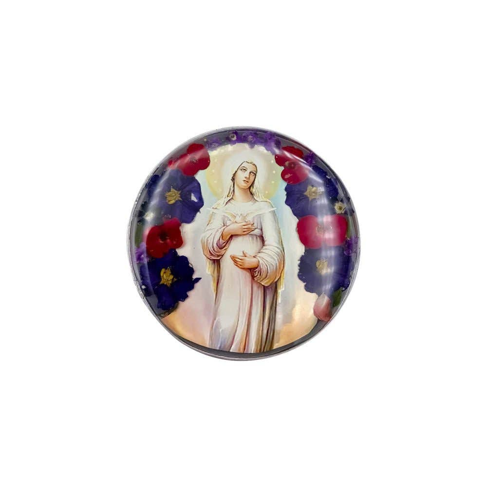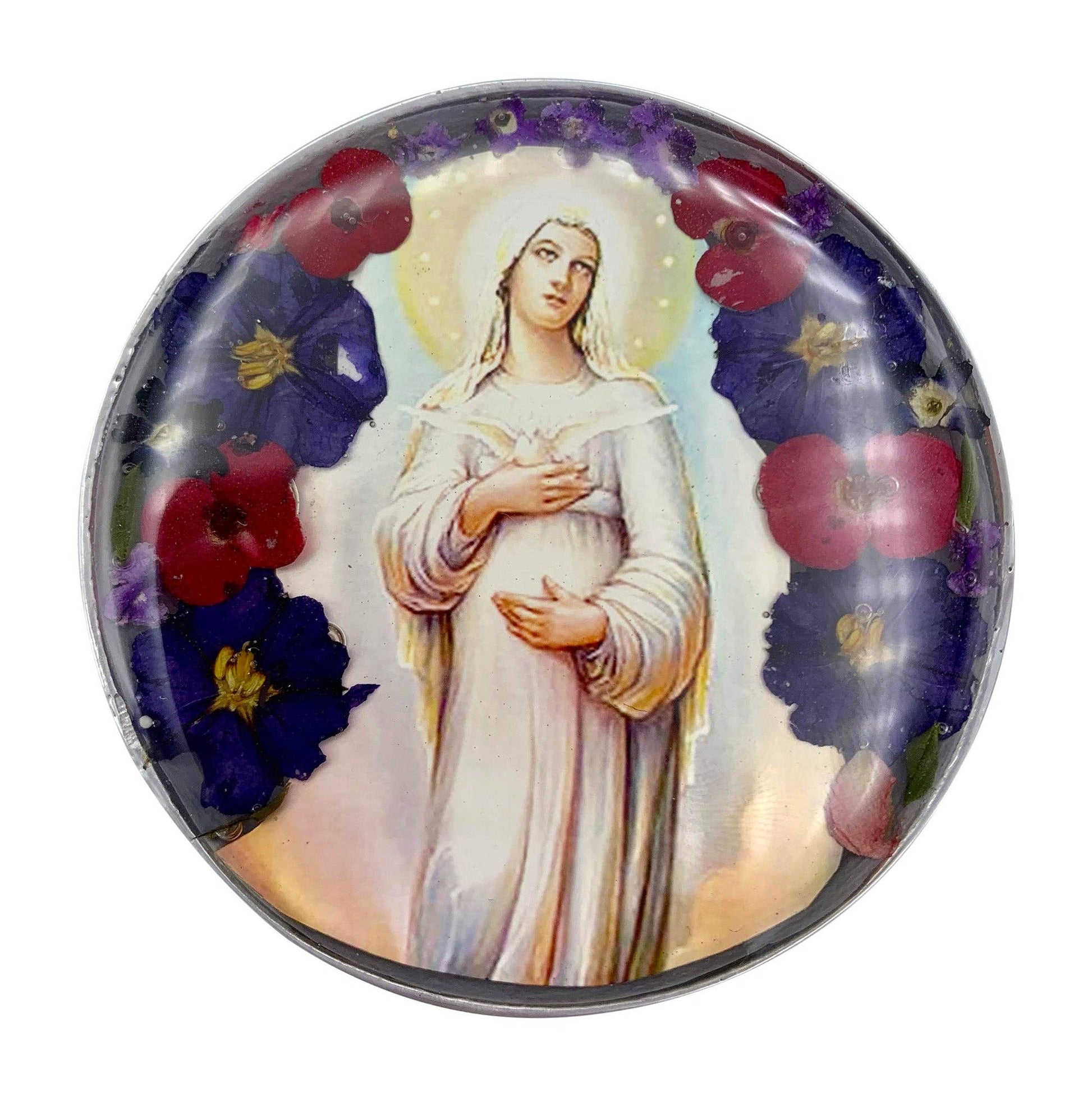 Handcrafted pewter box with a religious image of Our Lady on the lid. Includes intricate details featuring pressed wildflowers. Perfect size to store and protect your family's rosaries. An ideal addition to your home or altar, for any celebration! This Our Lady of Hope Pewter Rosary Box is the perfect addition for any home or altar, showcasing the colorful and vibrant designs that represent traditional Mexican folk art. Handcrafted from pewter, this rosary box features a detailed scene of Our Lady of Hope along with delicate pressed wildflowers arranged in an intricate pattern across the lid. 2.9" x 1.5" x 2"