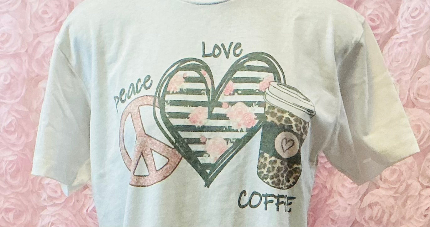 This stylish white tee combines a glittery pink peace sign, a black-and-white striped heart adorned with pink roses, and a trendy leopard print coffee cup. Perfect for expressing your love of peace, style, and your favorite brew, it’s a unique statement piece that adds charm and personality to any casual outfit. Comfortable and eye-catching, it’s a must-have for those who want to stand out with a message of positivity and flair. Only one size left; size small.
