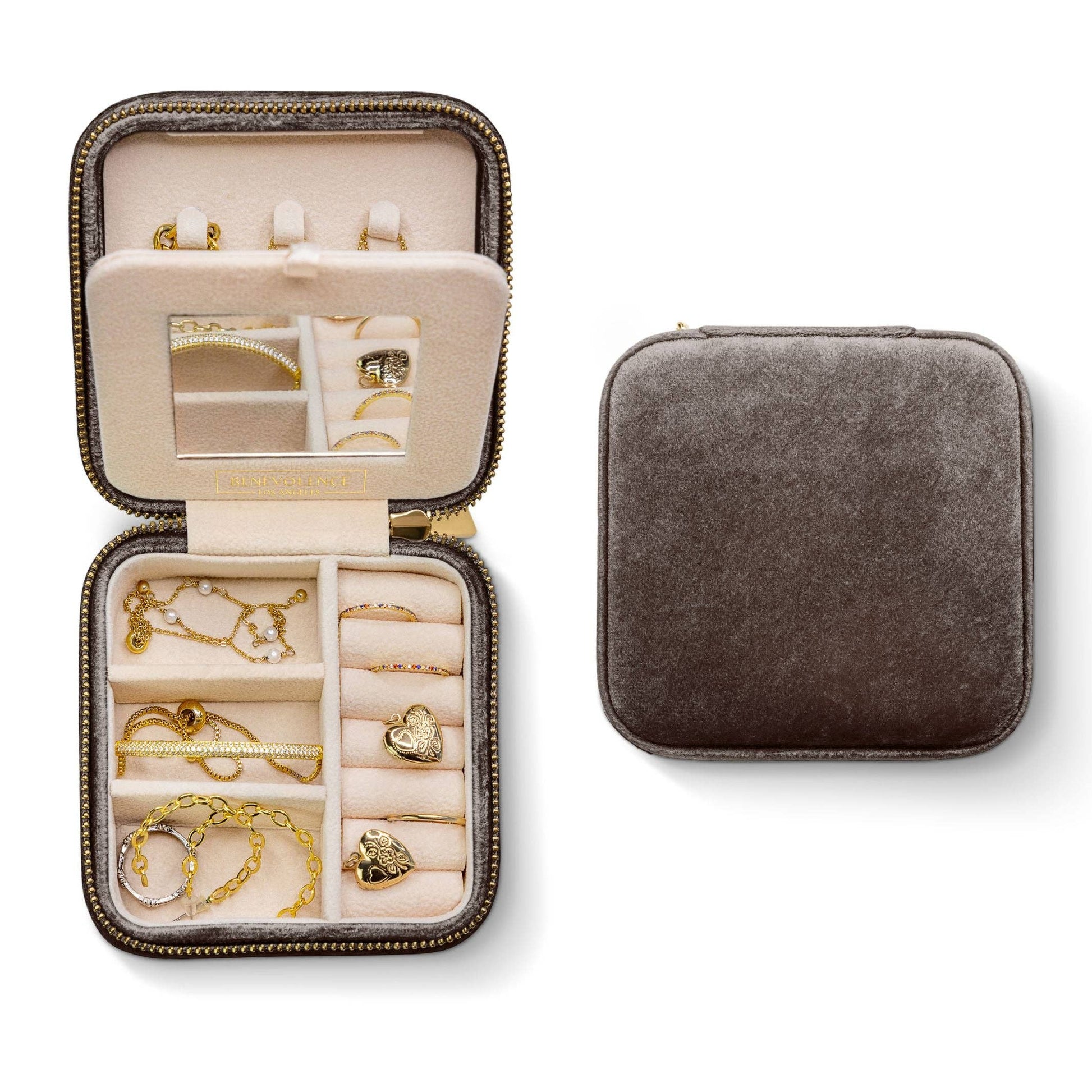 Indulge in luxury with our Plush Velvet Square Jewelry Box in Dusty Pink. Featured on Oprah's Favorite Things, it's the perfect gift for any jewelry lover. Made with textured velvet, it features a secret compartment and compact mirror. Say goodbye to tangled necklaces with its travel-friendly design and sophisticated gold zipper.
