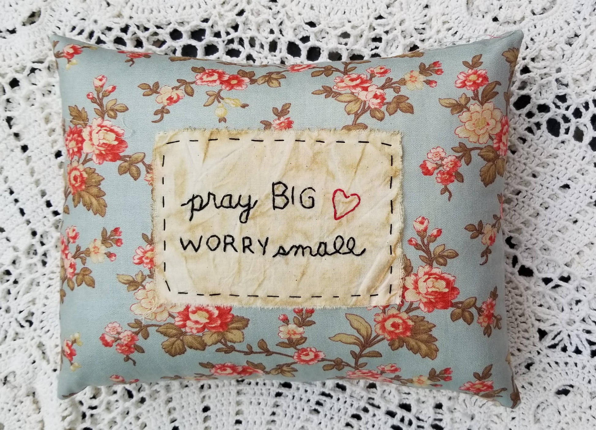 Handmade floral print Pray Big, Worry Small Pillow made with tea dyed cotton fabric, DMC thread, and cotton stuffing. 8" x 10" stitchery pillow.