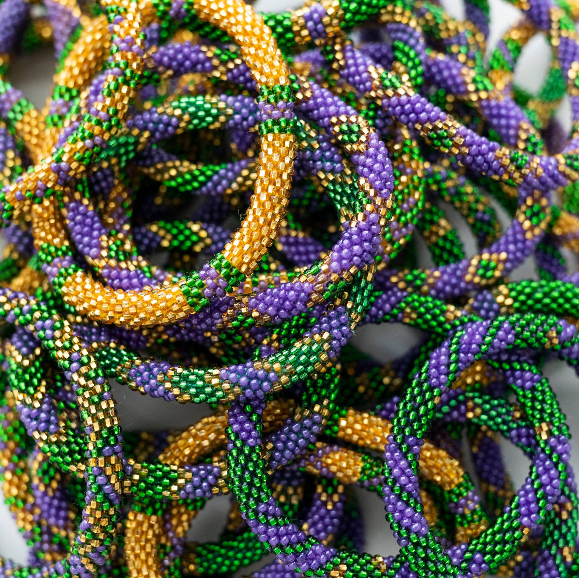 Our Mardi Gras Roll-On® Bracelets will take you to the streets of New Orleans, Louisiana during the weeks surrounding Mardi Gras. The green, purple, and gold colors of this bracelet set truly encapsulate the energy of Mardi Gras in NOLA with the exciting parades, floats, music, and long strings of beads. These handmade bracelets are a need for the holiday. The Original Roll-On® Bracelet is approximately 7” round, high quality glass beads and hand-dyed cotton thread that expands over your hand to fit most wrists. The design style tossed to you at your doorstep will be picked by our staff! Happy Mardi Gras!
