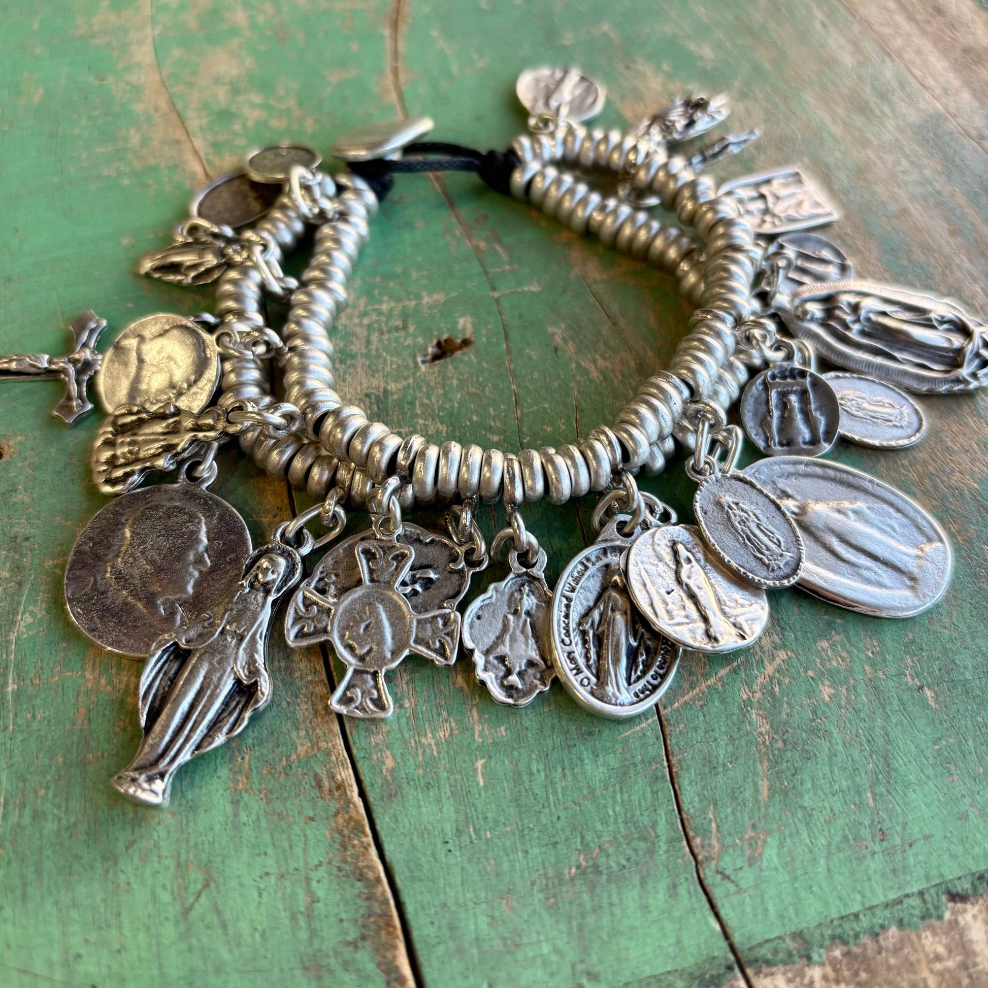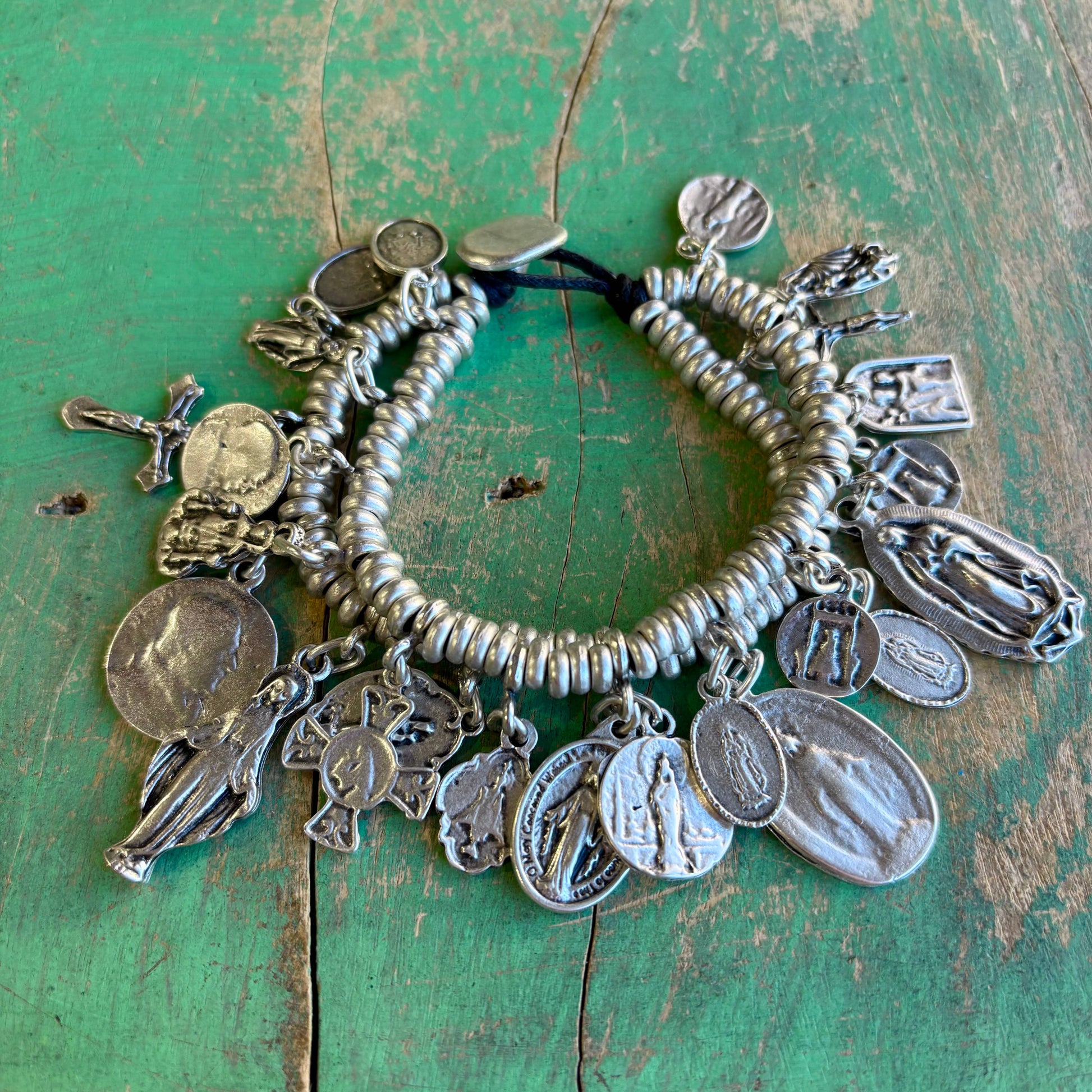 Find comfort and protection with our non-tarnishing, hypo-allergenic Saint Charm Bracelet. This 7.5" two strand bracelet features 23 religious medals, providing a unique and personal connection to your faith. Each bracelet is one-of-a-kind, with medals that may vary slightly. Wear it with confidence and let the saints guide your path.