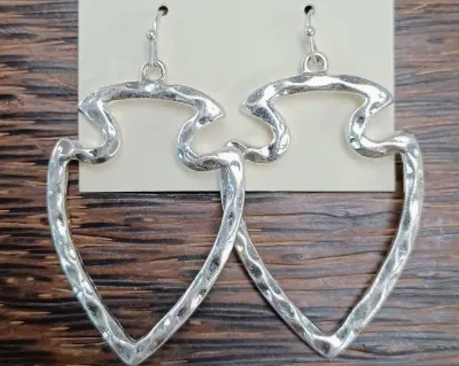 These Silver Arrow Dangles feature meticulously hammered metal formed into distinctive arrowhead shapes with substantial width. The hammering technique creates a textured surface that captures and reflects light from multiple angles, enhancing dimensional depth. The wide arrowhead design offers a contemporary interpretation of a classic motif, balancing visual impact with wearable proportions for versatile styling options.