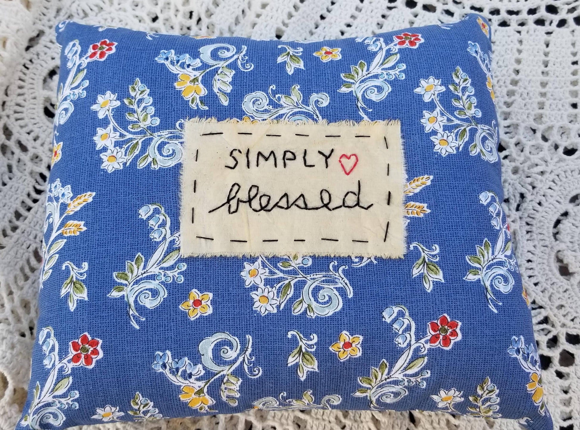 Handmade Simply Blessed Pillow in blue made with tea dyed cotton fabric, DMC thread, and cotton stuffing. 8" x 10" stitchery pillow.