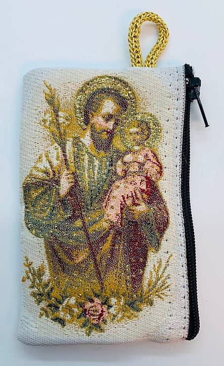 This rich tapestry rosary pouch features St. Joseph printed on both sides with a secure zipper closure. Measuring 3″ x 4″, it's crafted from durable tapestry material with an inner lining for added protection. The compact size makes it ideal for safely storing and transporting your rosary beads while honoring the patron saint of families.
