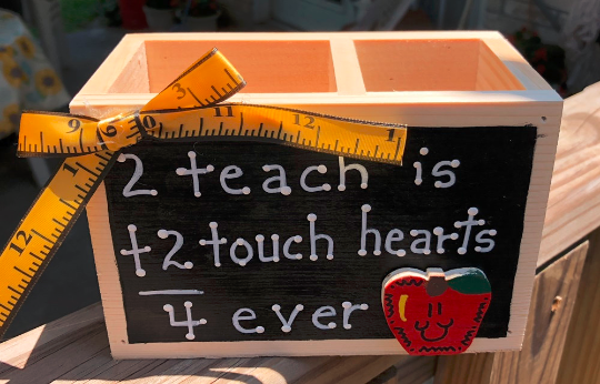 Keep your teaching treasures tidy with this adorable handmade supply box! Perfect for pens, rulers, scissors, and all your classroom must-haves. The built-in divider keeps everything organized, while the sweet "2 Teach is 2 Touch Hearts 4 Ever" message on the front reminds you why you do what you do! Measures 6"L x 4"H x 3¼"D - just the right size for your desk. Supplies not included (but inspiration definitely is)!
