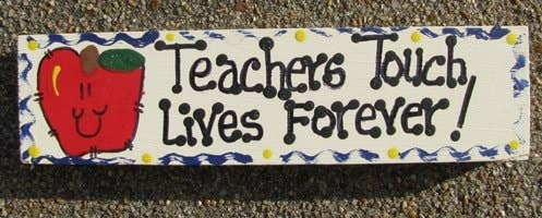 This charming wooden block celebrates educators with a heartfelt "Teachers Touch Lives Forever" message alongside a cheerful painted apple. Bordered with navy blue edges and sprinkled with playful yellow dip dots, this 8" x 3" keepsake makes the perfect classroom decoration or thank-you gift that's sure to bring a smile to any teacher's face!