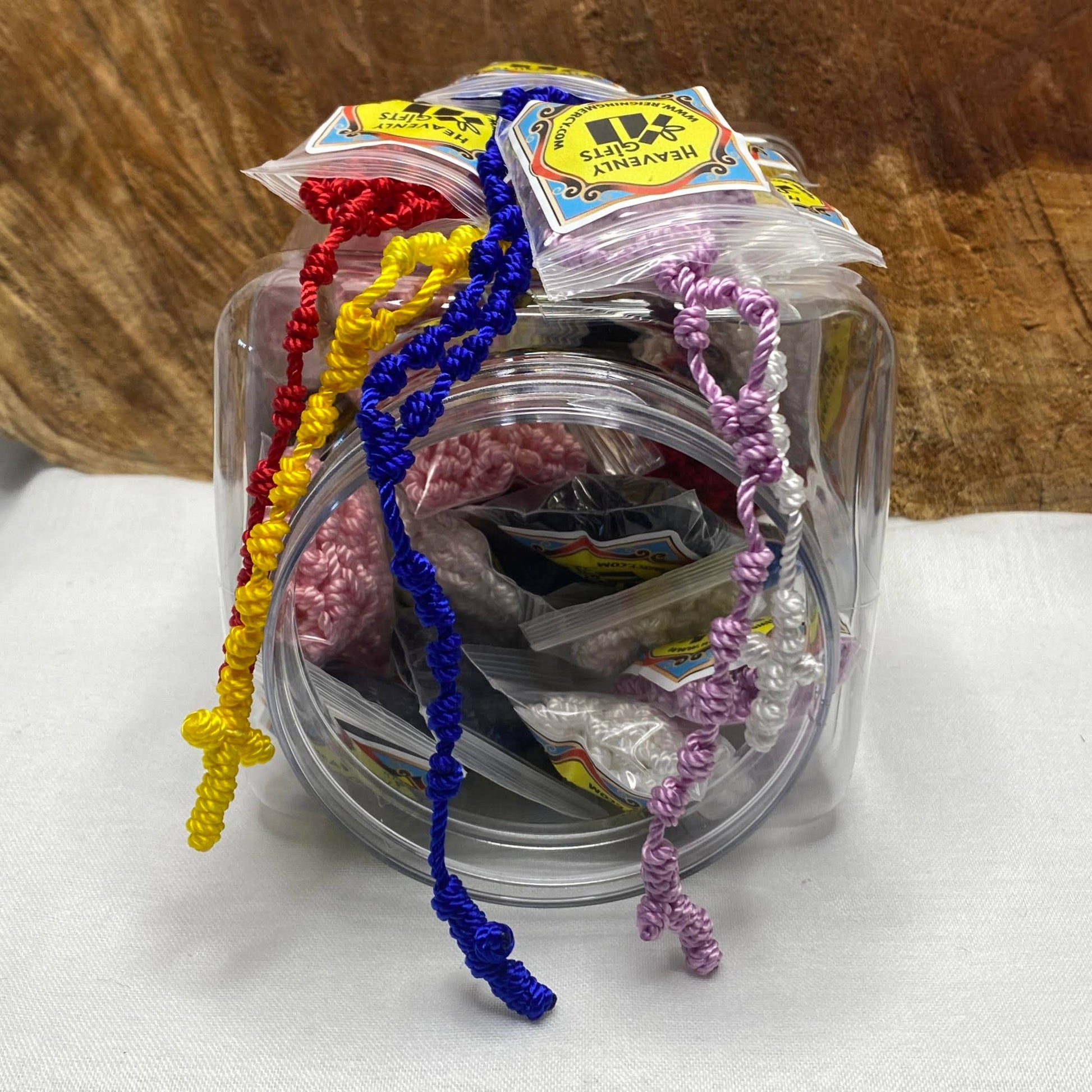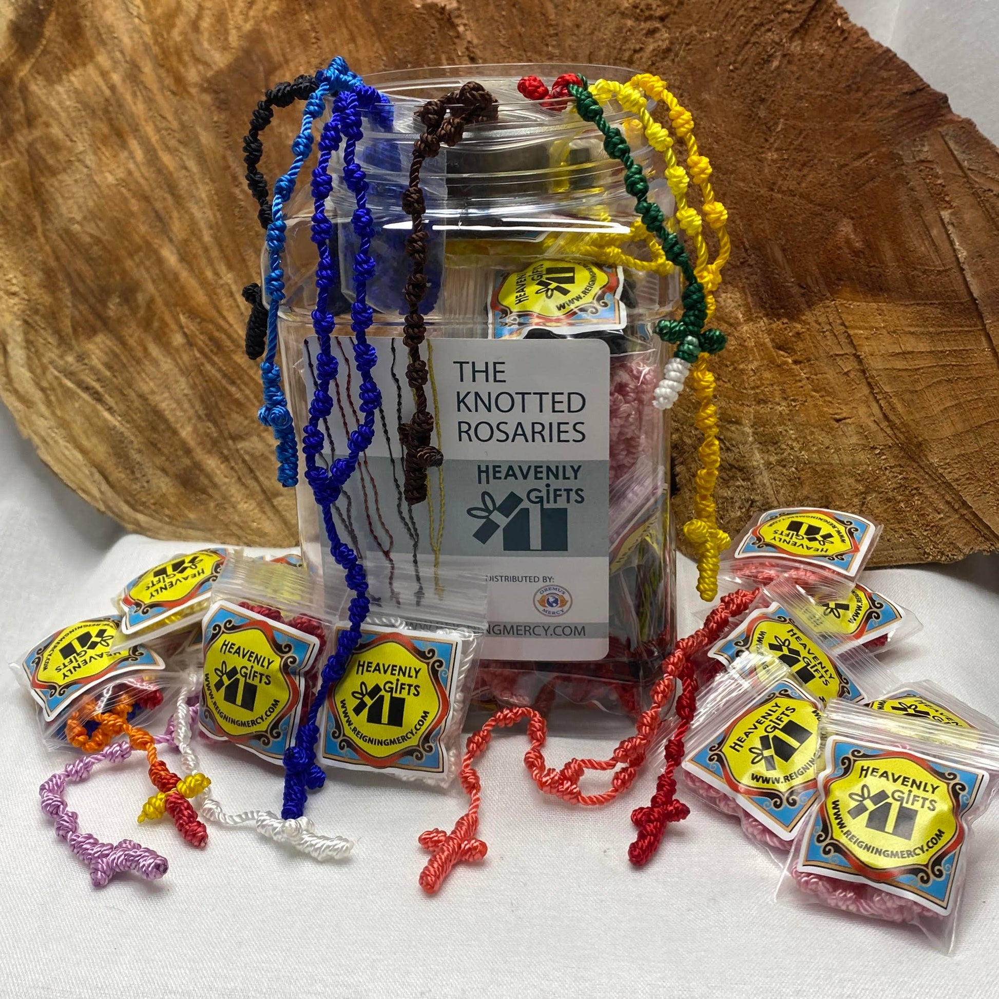 Large colorful hand-tied Knotted Rope Rosaries made in Puebla Mexico by a group of Senior Citizens. Assorted colors and individually packed in polybags for easy grabbing. Collect all the colors. Rosary Measures 18" Minimum. Buying these rosaries helps to support our senior citizens.