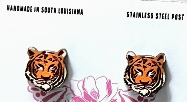 Show your wild side with these Tiger Face Hand Painted Stud Earrings! These tiny wood earrings feature a hand-painted design of a fierce tiger face, perfect for any LSU or Louisiana fan. Made with hypoallergenic stainless-steel posts and settings, these earrings are both stylish and safe for sensitive ears. Roar with style! (rawrrr!)