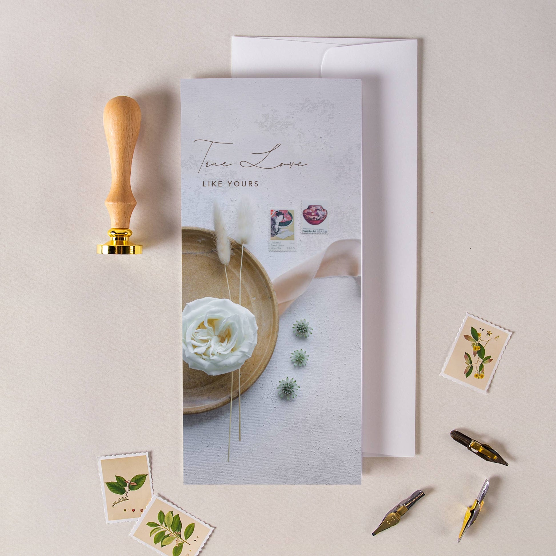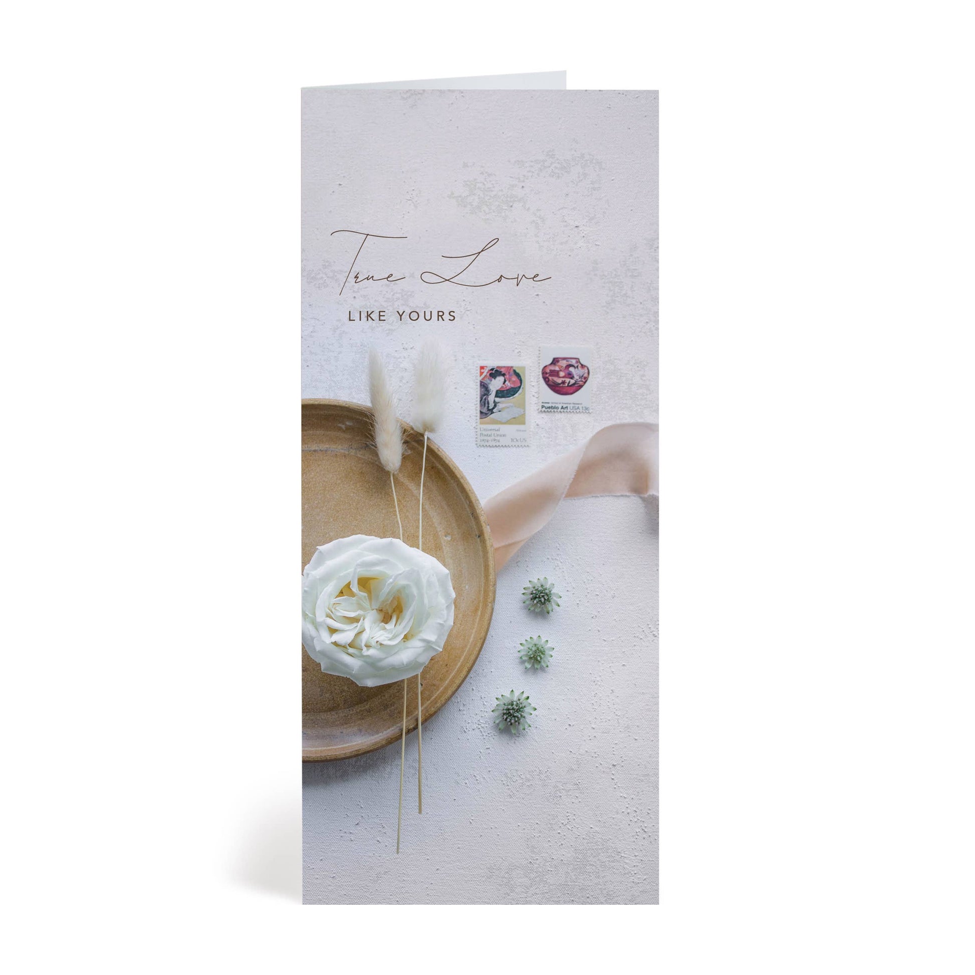 Printed on premium, matte paper, this card features an inspirational sentiment paired with a Bible verse inside. "True Love Like Yours Is Beautiful, And Only from Above. A cord of three strands is not easily broken. Ecclesiastes 4:12 White envelope included.