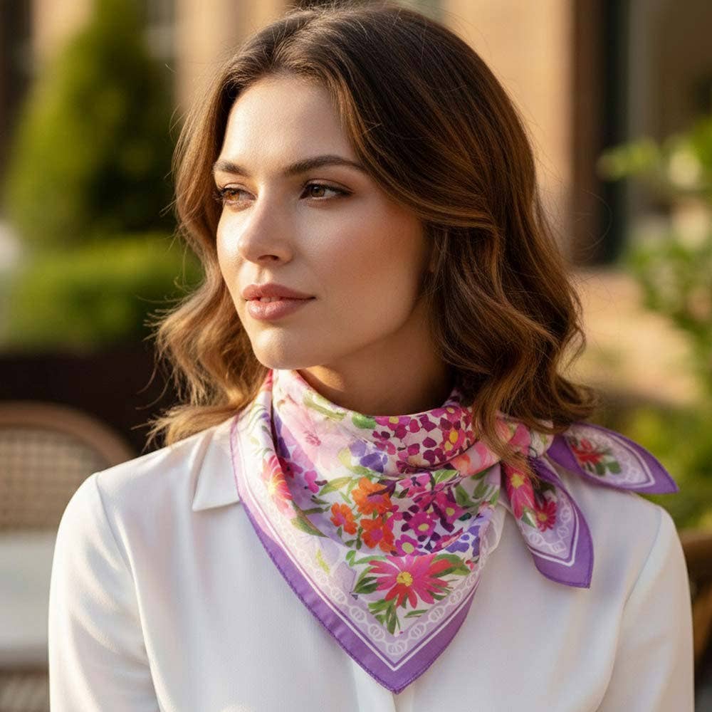Elegant square fashion scarf showcasing a vintage-inspired floral garden pattern with layered botanical details. Designed for versatile styling on the neck, hair, wrist, or handbag, this timeless accessory adds a soft romantic touch to everyday outfits, seasonal collections, and curated boutique assortments.