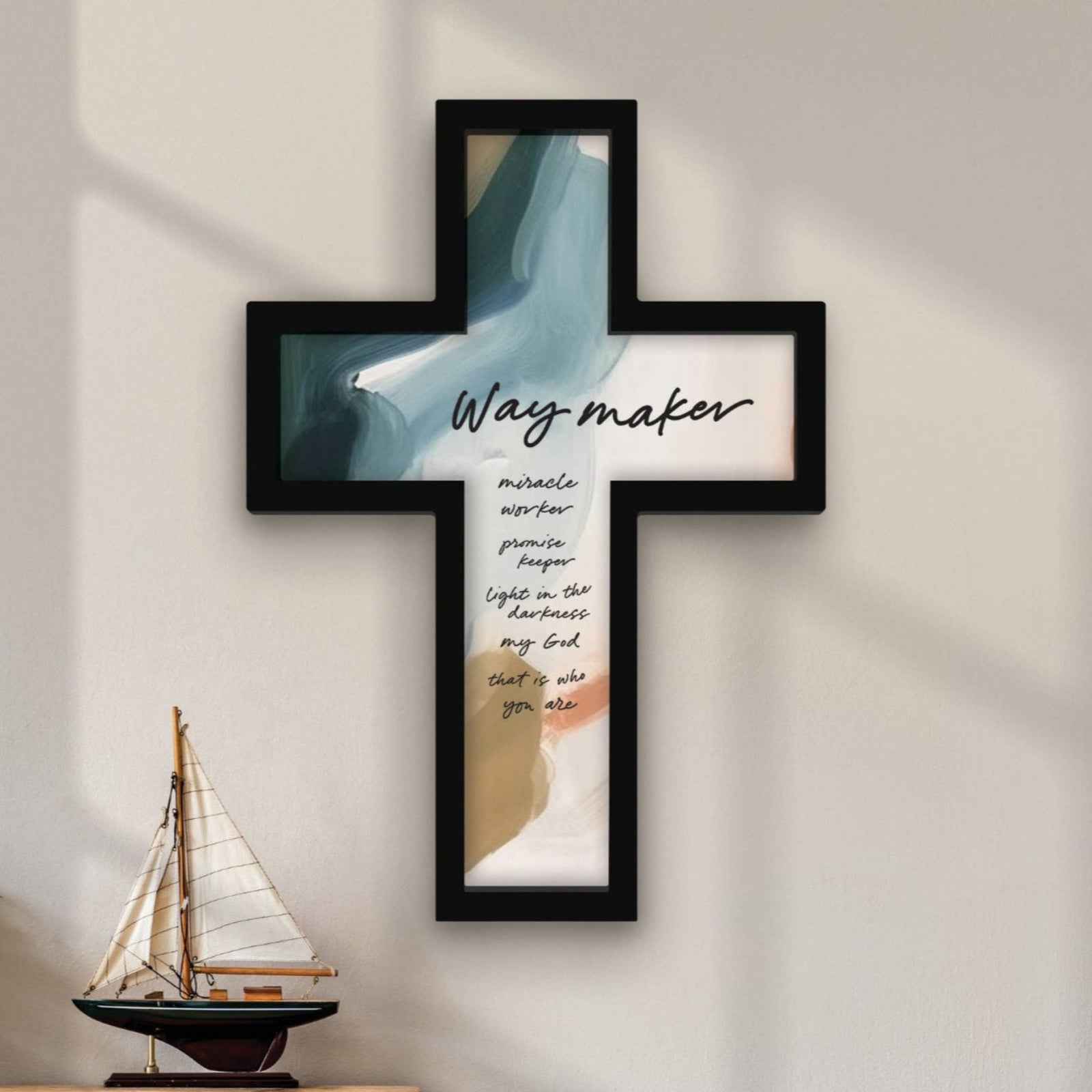 The Way Maker Cross beautifully symbolizes both sacrifice and hope, serving as a daily reminder of divine love and presence. Its traditional design embodies the comforting promise that you are never alone, with each glance reinforcing faith in the One who makes ways, performs miracles, and keeps promises even in life's darkest moments. 24" X 34"